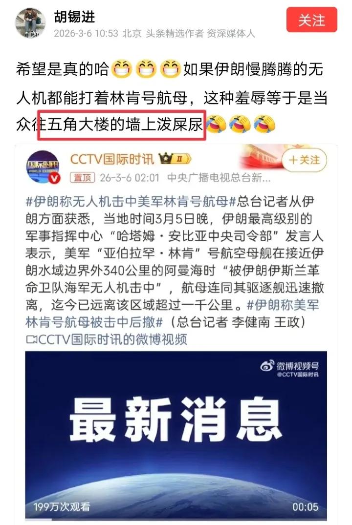 胡锡进一会儿担忧伊朗自不量力,一会儿讥笑美国狼狈不堪,这是怎么回事呢? 原来开战之初伊朗损失惨重,胡锡进马上唱衰伊朗“能力支撑不了雄心”,老胡声称这是“伊朗血的教训”。 过了几天伊朗越发顽强,反而是美国被伊朗打得灰头土脸,胡锡进一看风向不对,就开涮美国“这种羞辱等于是当众往五角大楼的墙上泼屎尿”。 那么胡锡进如此麻溜的见风使舵,老胡是进退自如还是进退失据呢?