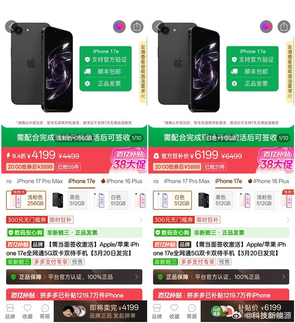 【iPhone17e未开卖已破发】根据官方,iPhone 17e将于3月11日正式开售,起售价4499元。其中256GB版本在享受国补后的到手价仅为3999元,而512GB版本定价为6499元,目前不享受国补政策。但某电商平台,iPhone 17e全系已开启立减300元的优惠活动。256GB版本到手价降至4199元,512GB版本到手价为6199元。