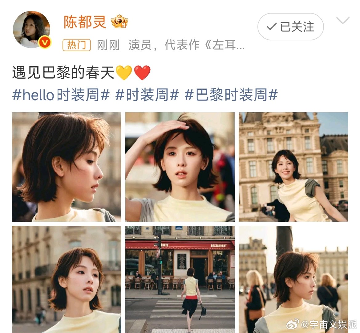 巴黎的春天下的陈都灵陈都灵短发状态微风拂过超短发,陈都灵在巴黎街头自在漫步。撞色穿搭与复古建筑相映,抬眼间尽是东方少女的灵动,每一帧都像春日电影截图。