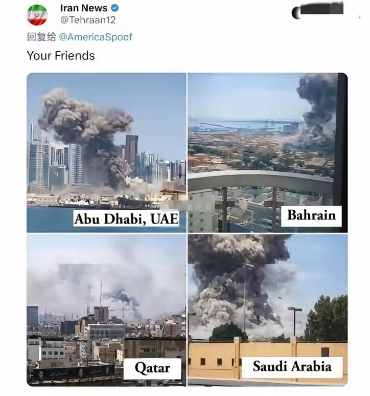 伊朗发布新闻图片,显示伊朗打击美国驻外领馆被炸图片。下图依次为美国驻阿联酋、巴林、卡塔尔和沙特大使馆被炸的场面。伊朗宗教届还发出面向特朗普和内塔尼亚胡的追杀令。就凭打击美国驻外领事馆这件事,就应该为他们点赞[赞][赞][赞]
