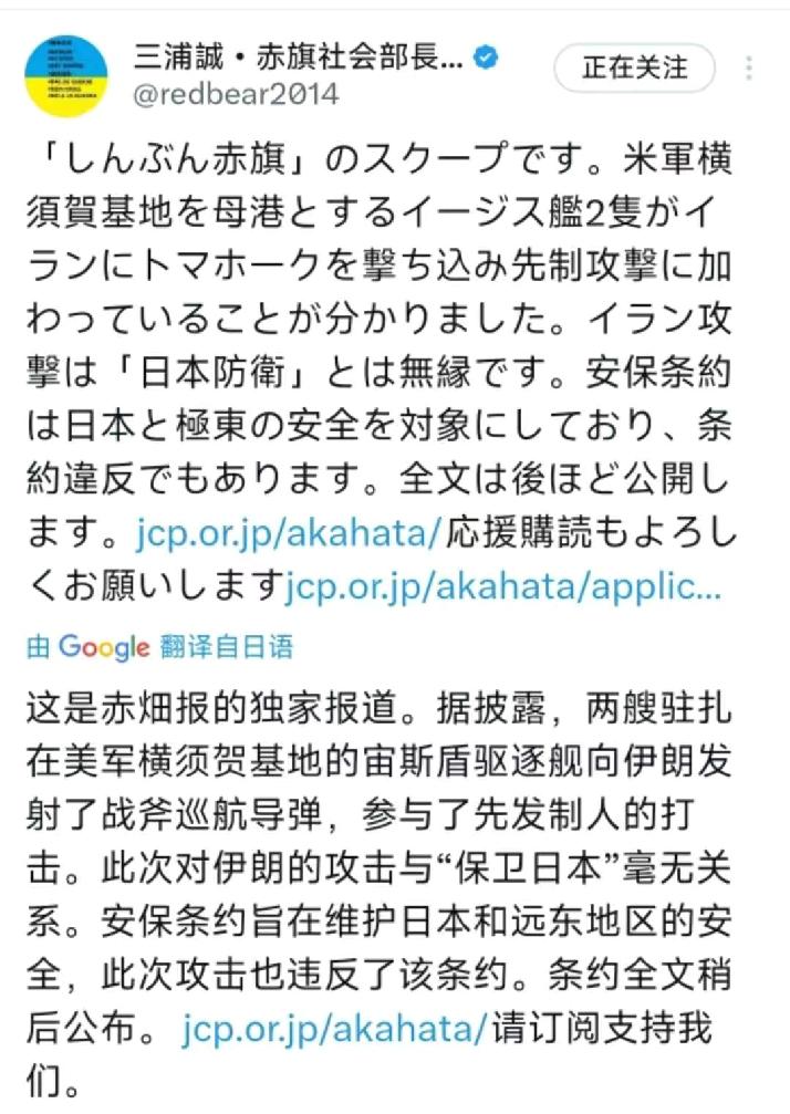 3月6日,日本《赤旗报》发文写道:“据悉,以美军横须贺基地为母港的两艘宙斯盾舰发射战斧导弹袭击了伊朗,参与了此次先发制人打击。对伊朗的攻击与‘日本防卫’毫无关联,日美安保条约的适用对象为日本及远东地区的安全,美方此举同时也违反了该条约。” [机智]横须贺发弹,戳破日美同盟的“防卫谎言”!横须贺基地宙斯盾舰射战斧打伊朗,这记“实锤”直接把日美安保条约的“防卫属性”打回原形。按日方官方界定,日美安保条约适用范围仅限日本及远东,和中东战事毫无关联。这已不是美国首次“越界”。从冷战时借基地介入远东事务,到如今把日本港口当全球兵站,同盟早已成美国的“单向工具”。更讽刺的是,日本刚提前一年采购数佰枚战斧,想借美制导弹强化所谓“防卫”,却先被美军用自家基地的导弹,绑上了远离本土的战争战车 。 此事最刺痛的,是日本的“主权幻觉”。美军想打就打,基地想用就用,所谓“共同防卫”,不过是美国让日本买单的“安全陷阱”。当同盟沦为霸权的附庸,日本看似抱紧了大腿,实则一步步把自己推向了不可预测的风险漩涡。