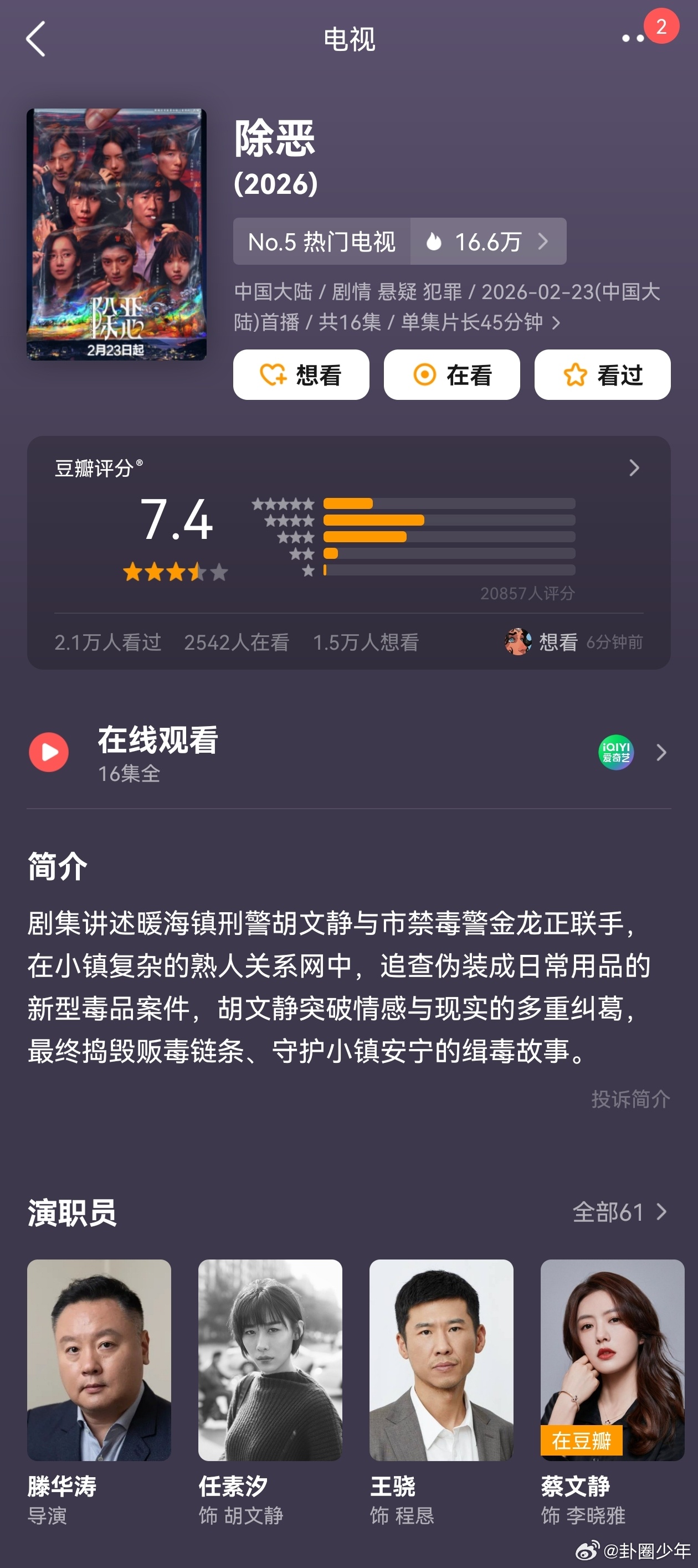 近期五部剧开分五部新剧评分出炉,《除恶》7.4分领跑,各剧口碑分化,反映不同观众