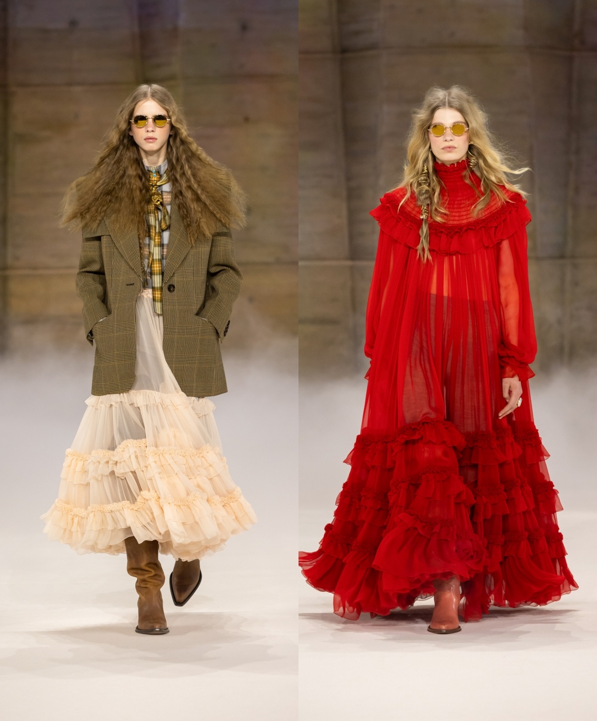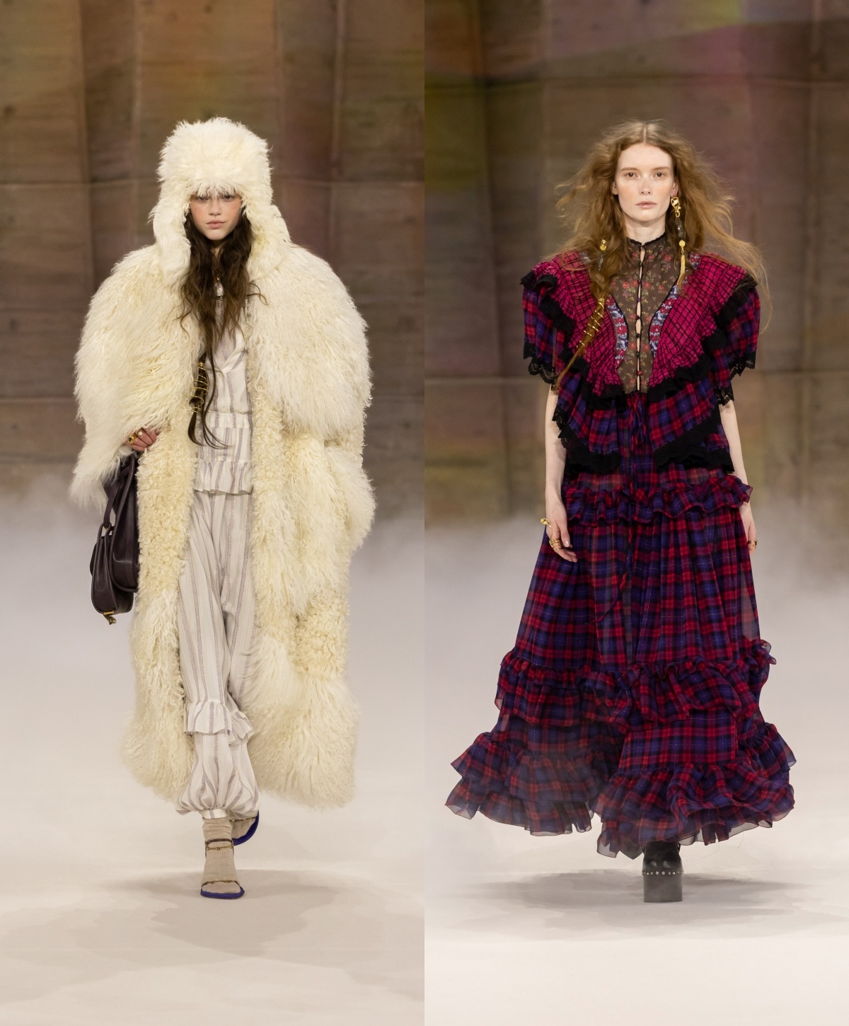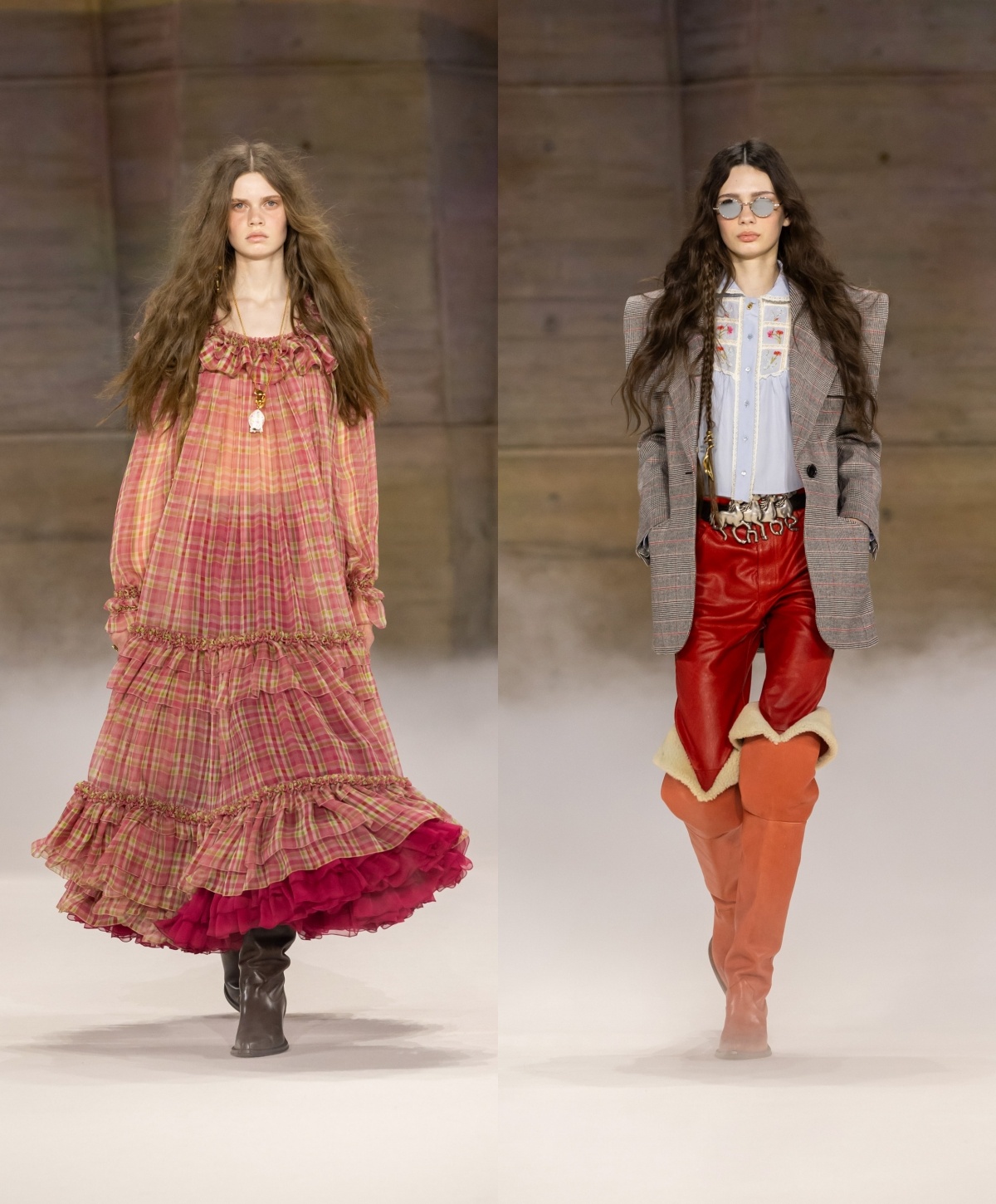 今季仍然看到波希米亚风的浪漫,过去不时出现的层叠荷叶边长裙主导多个造型,带来宽松、舒适的轮廓,并随模特儿轻轻摆动。细看之下,浪漫之中暗藏个性:复古格纹与碎花布料与光泽感强烈的皮革相遇,不规则的拼凑印花与材质拼接,流露着有机而真实的人性温度。