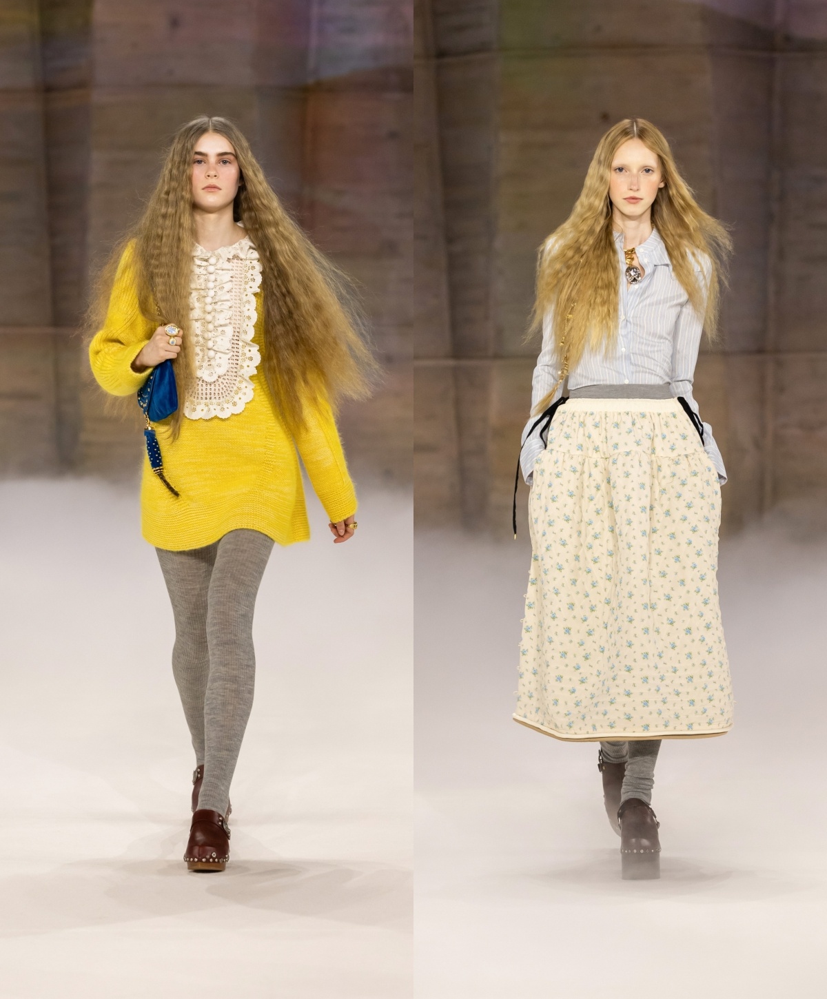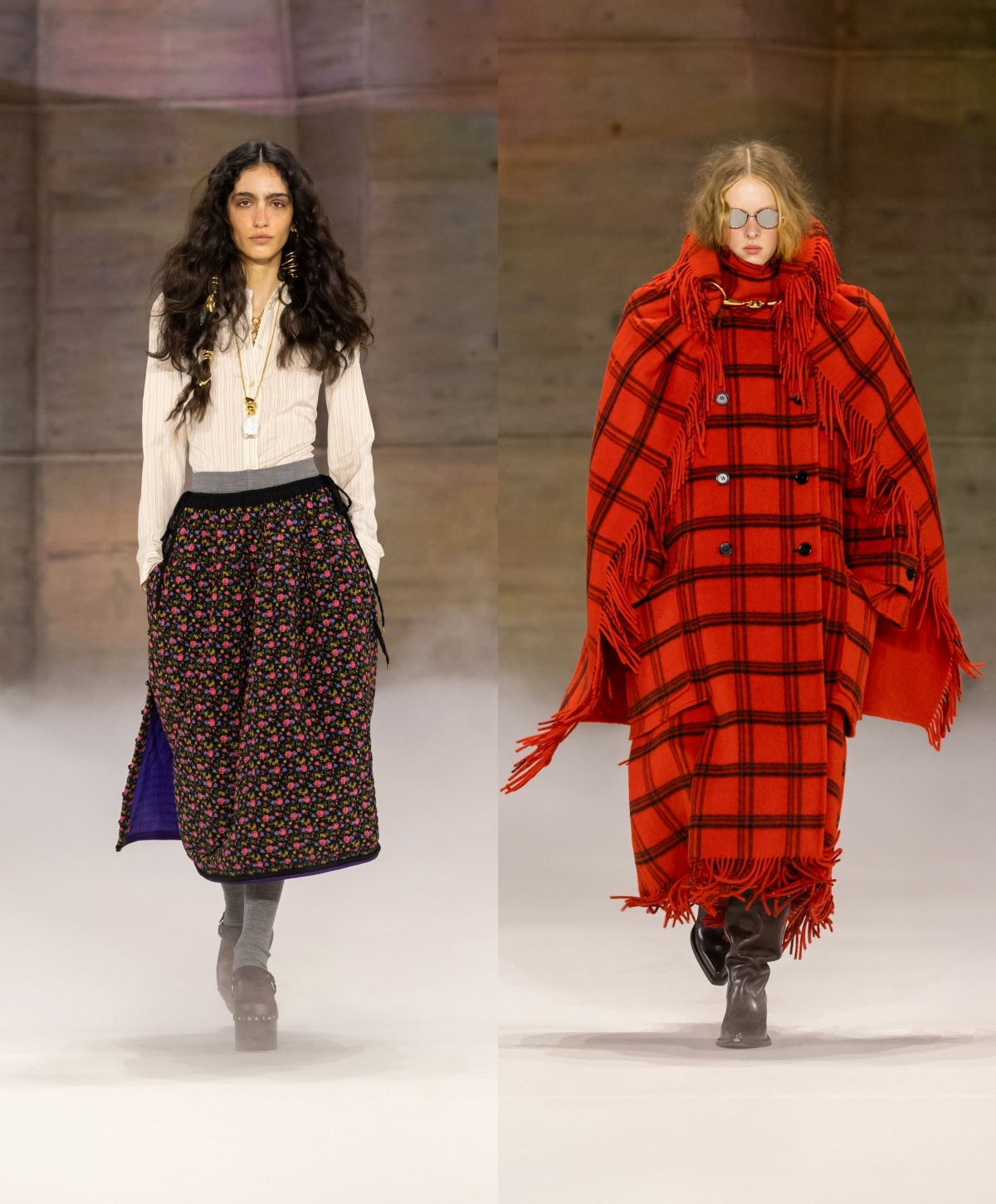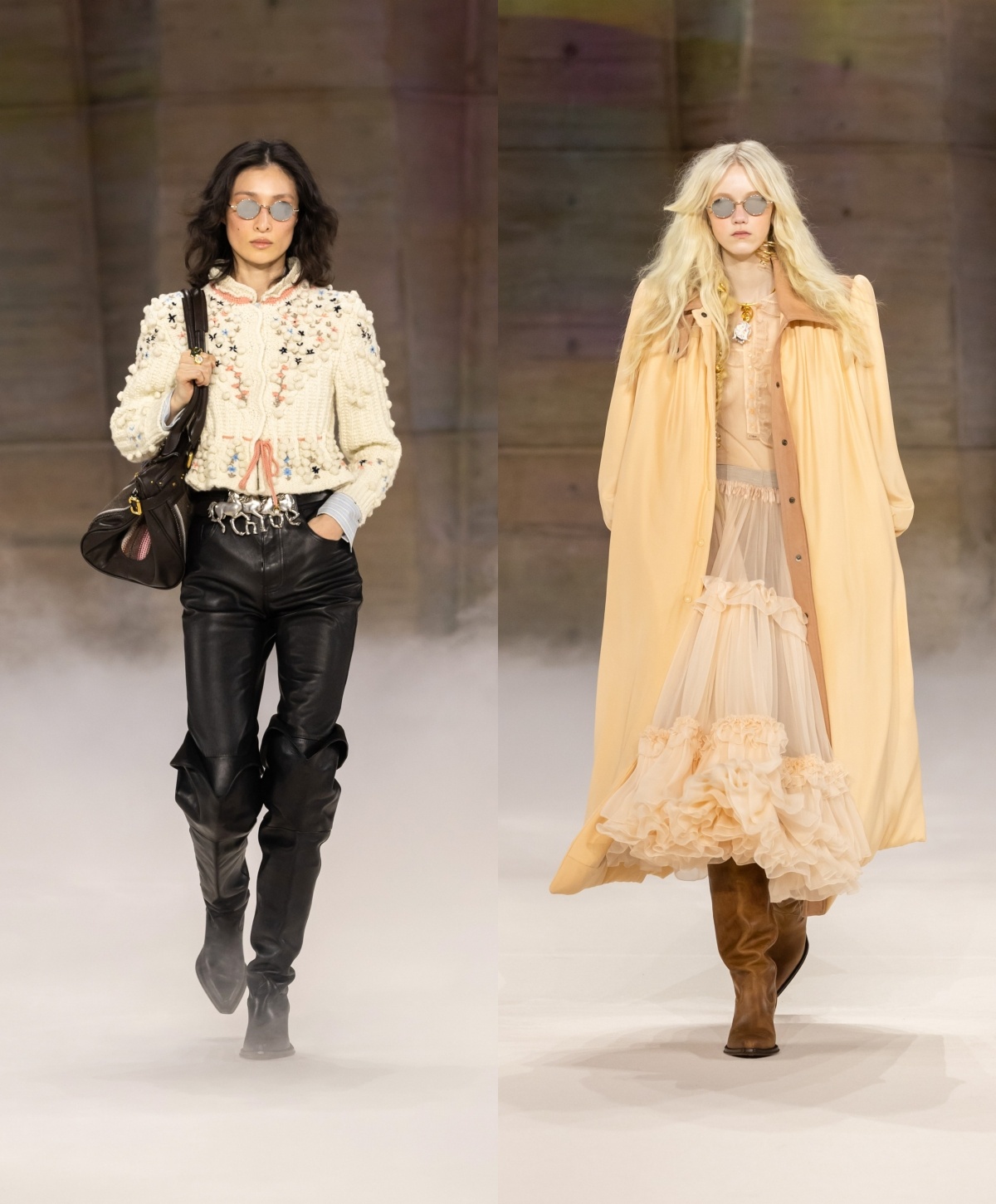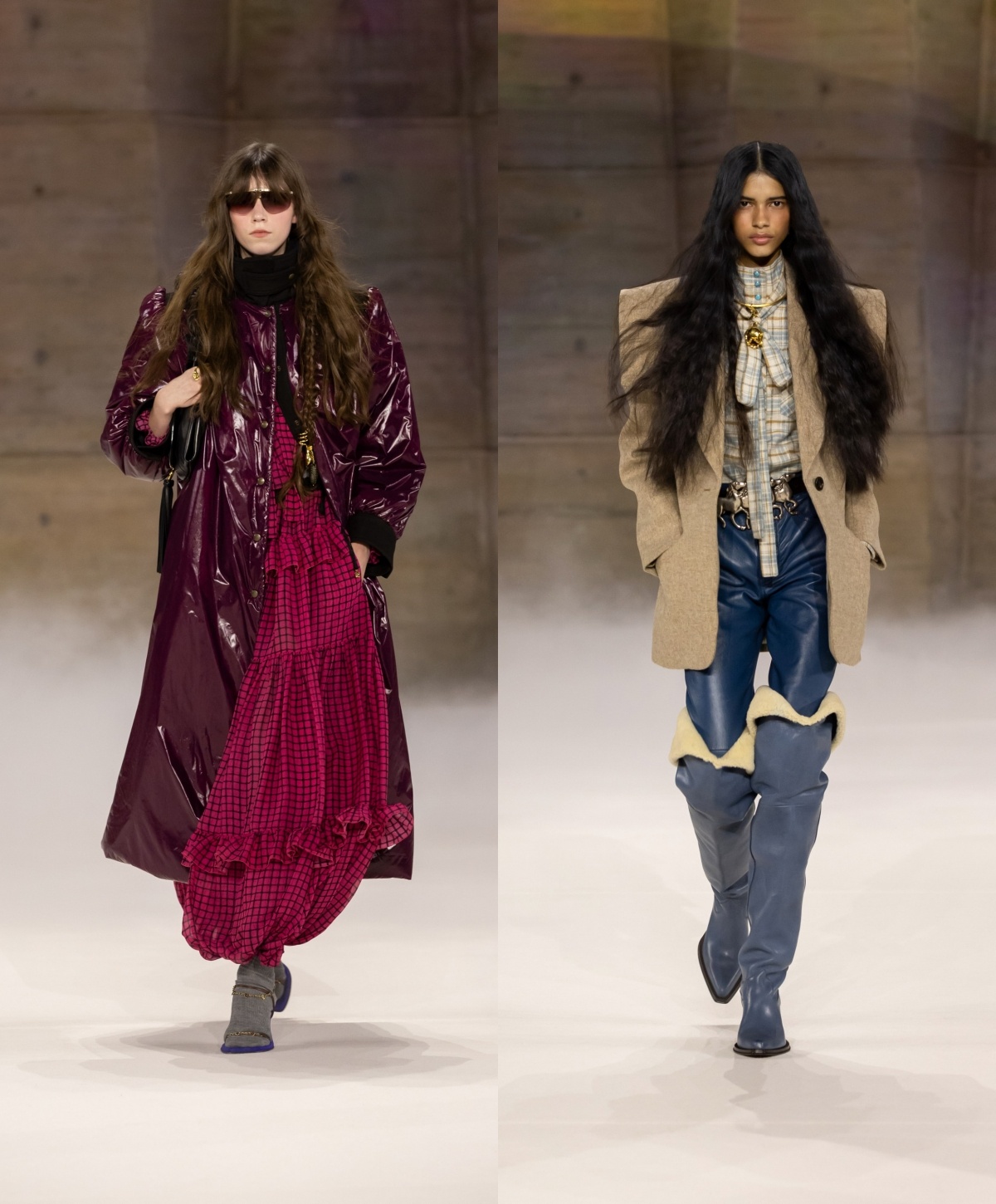 今季仍然看到波希米亚风的浪漫,过去不时出现的层叠荷叶边长裙主导多个造型,带来宽松、舒适的轮廓,并随模特儿轻轻摆动。细看之下,浪漫之中暗藏个性:复古格纹与碎花布料与光泽感强烈的皮革相遇,不规则的拼凑印花与材质拼接,流露着有机而真实的人性温度。