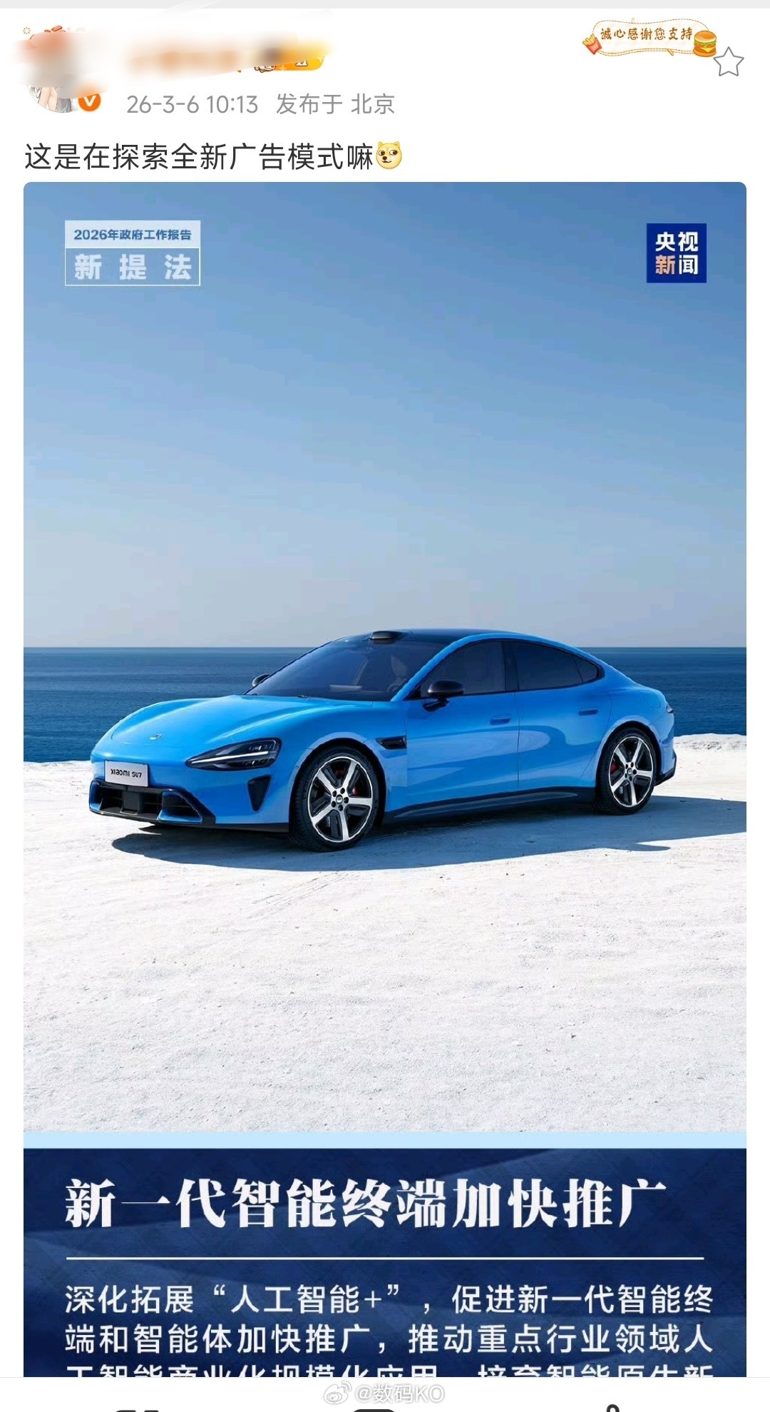 昨天小米新一代su7作为背景图,看来还是刺激到了一些人,能说出这样话的人,干脆认证还是取消掉吧。2024年提出“新质生产力”,强调巩固智能网联新能源汽车优势;2025年以“创新”为关键词,要求大力发展智能网联新能源汽车等新一代智能终端;2026年新提法为“新一代智能终端加快推广”,深化“人工智能+”应用。其实还不止一年,是连续三年,看到这,更不得刺激到啊!