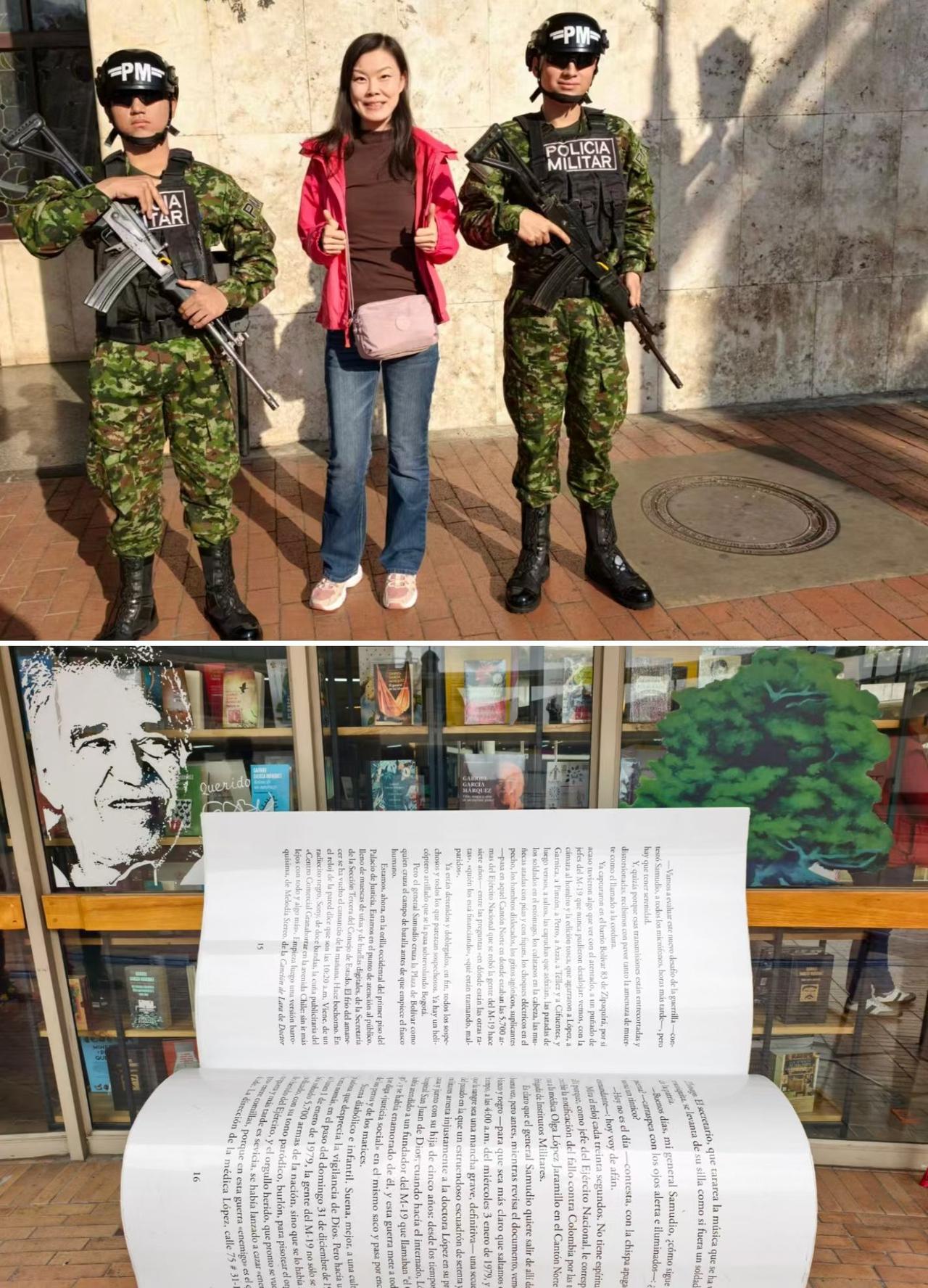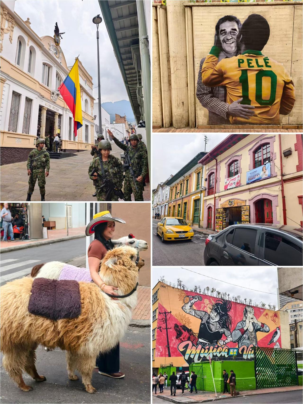 波哥大,“黄金国度”哥伦比亚🇨🇴的首都,这座由西班牙殖民者始建的老城,是马尔克斯口中“最震撼的城市”。16岁的“小马”揣着加勒比的炙热闯进来,虽遭遇了辍学、大哭和青春迷茫,却也走上了写作的道路,并埋下了《百年孤独》的魔幻种子。 如今的波哥大也很魔幻,满街持枪的警察不知道该让人觉得是危险,还是安全[破涕为笑] 波哥大一日游攻略: 1、蒙塞拉特山(Monserrate 图1):坐着百年有轨缆车到波哥大的制高点俯瞰全城,据说当年马尔克斯也经常上去。 2、黄金博物馆(Museo del Oro 图3):目前世界上最大的金器博物馆,最著名的除了“镇馆之宝“穆伊斯卡黄金船”,还有一颗价值连城的祖母绿宝石。早在17世纪中,哥伦比亚的黄金产量占世界总产量的40%,当然后来让西班牙搞走了。 3、玻利瓦尔广场(Plaza de Bolívar 图4):曾经西班牙王室建造的西班牙式大广场,广场上矗立着南美解放英雄玻利瓦尔的雕像。满是鸽子的广场上却“危机四伏”,当然我们也极为警惕,而且还有当地人好心提醒。 4、博特罗博物馆(Museo Botero 图5):主角当然是胖胖的蒙娜丽莎,毕加索、莫奈、雷诺阿都要靠边站。 5、圣母卡门教堂(Iglesia del Carmen 图6):外表红白条纹相间,极具辨识度,内部也像一座彩色城堡。 各种涂鸦的街道、被招揽拍照生意的羊驼、无意中走入的跳蚤市场、轰轰作响的摩托车党、乐意合影的持枪帅警察,一切仿佛诉都在说着“过去都是假的,回忆是一条没有归途的路,以往的一切春天都无法复原……” 所以珍惜此刻,活在当下。 PS:外籍游客停留不超过60天,离开波哥大时可退离境税,一人136000比索,合200多人民币,当然要主动提出来。第一次离开一个国家还领了钱,魔幻呀~[偷笑]