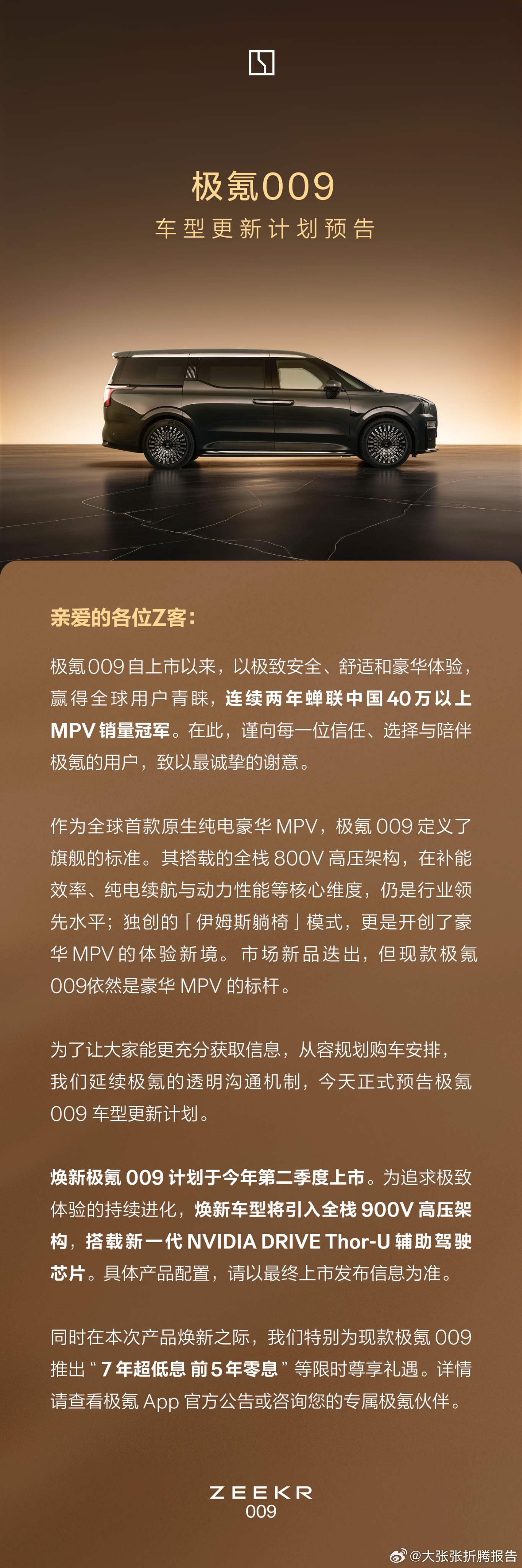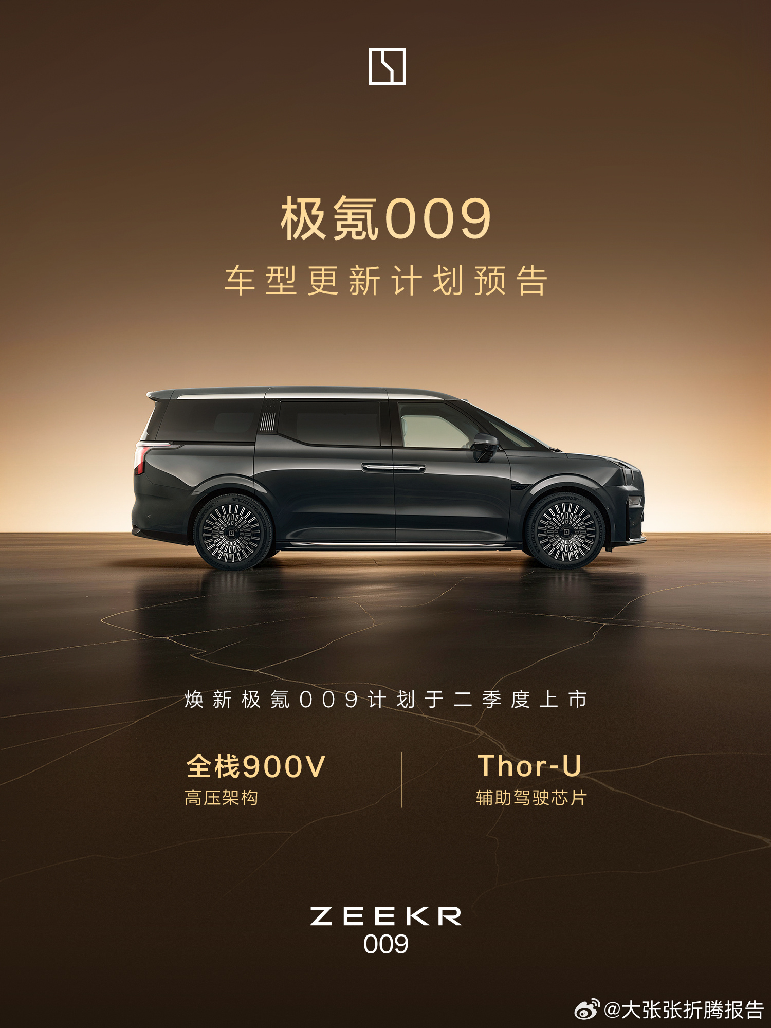 极氪009焕新官宣 极氪009预告二季度焕新上市,升级全栈900V高压架构+NVIDIA DRIVE Thor-U智驾芯片,豪华再进阶。