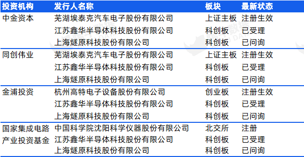 共有197家投资机构参与上述企业的投资,其中,中金资本、同创伟业、金浦投资、国家集成电路产业投资基金出手3次,最为活跃。