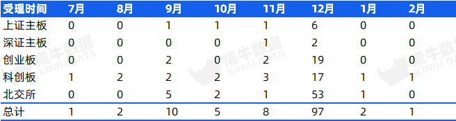 根据上交所、深交所、北交所公告数据统计,沪深北交易所仅科创板受理1家企业。
