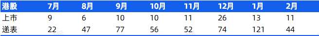 2月,港股共有11家公司上市,较1月小幅降低,共有44家公司递表港交所,较1月的121家大幅降低。