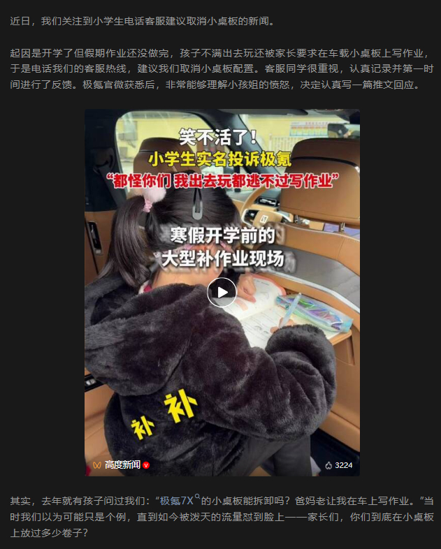 极氪回应小孩姐取消小桌板建议 稍早前,有一位“小孩姐”不满出去玩还被家长要求在车载小桌板上写作业,拨通客服热线建议取消小桌板配置……极氪官方今天特别认真的,回复了这个建议。有一段写的挺好: