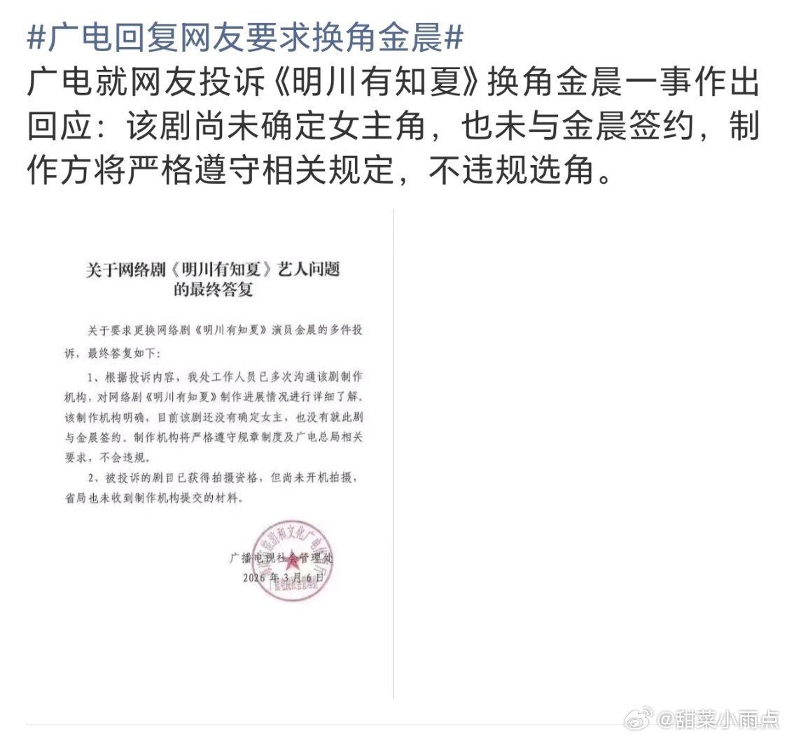 广电回复网友要求换角金晨广电竟然会回复,《明川有知夏》原本网传是黄景瑜和金晨。金