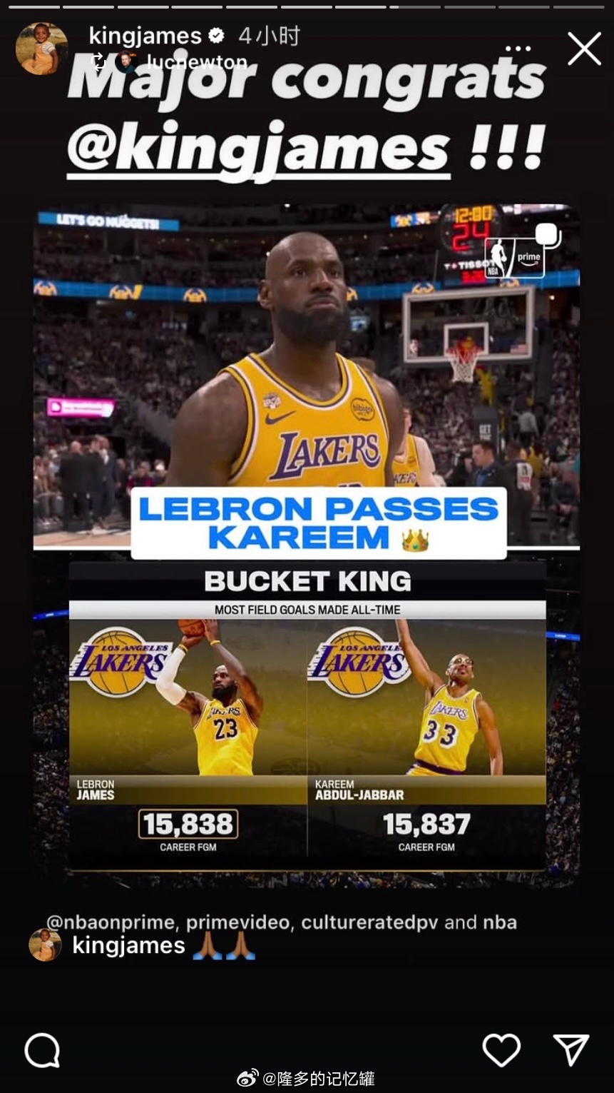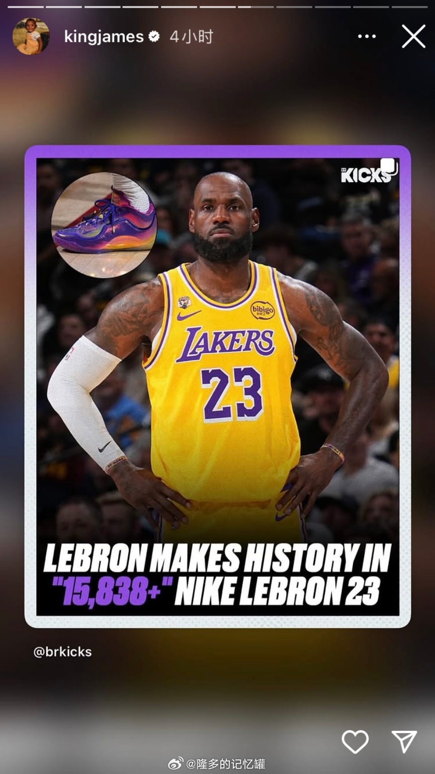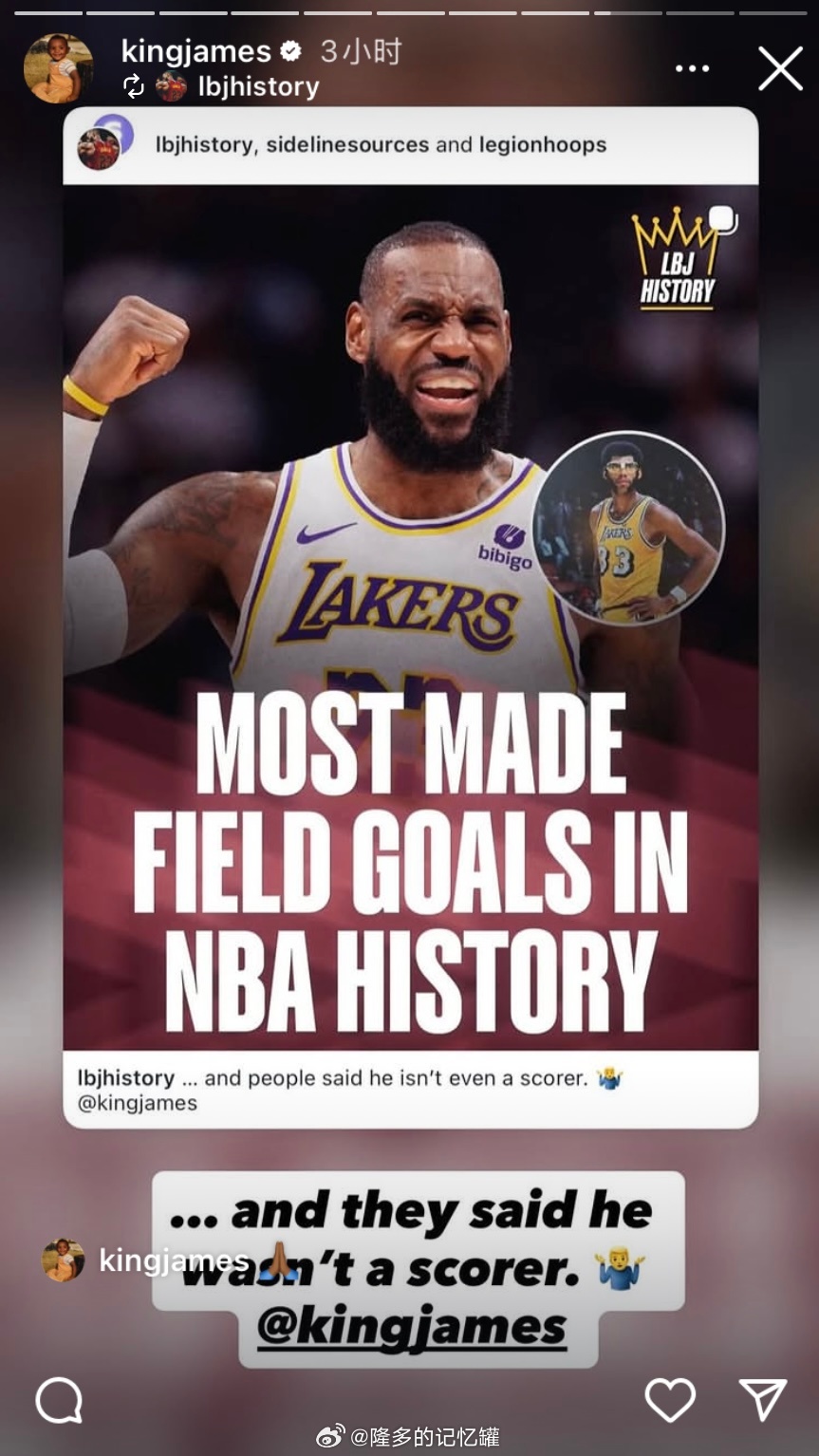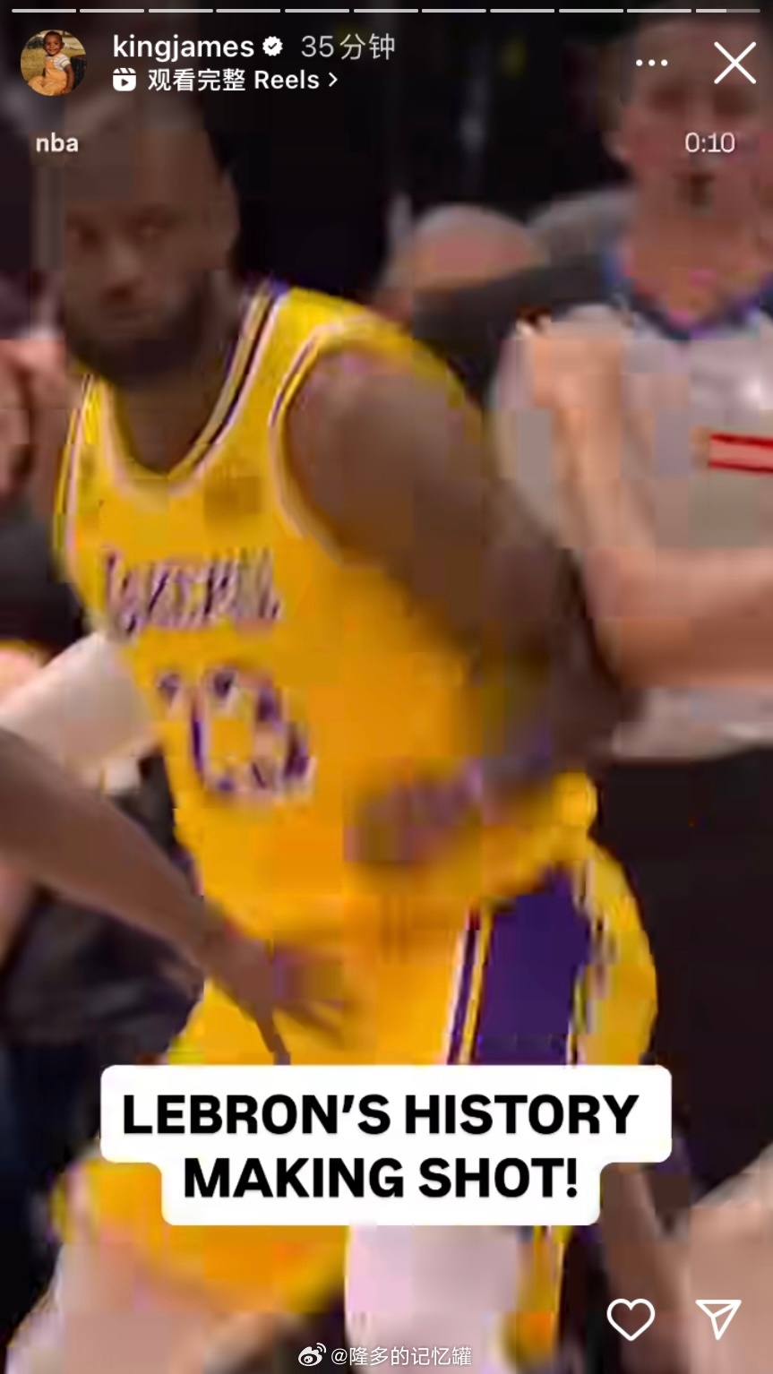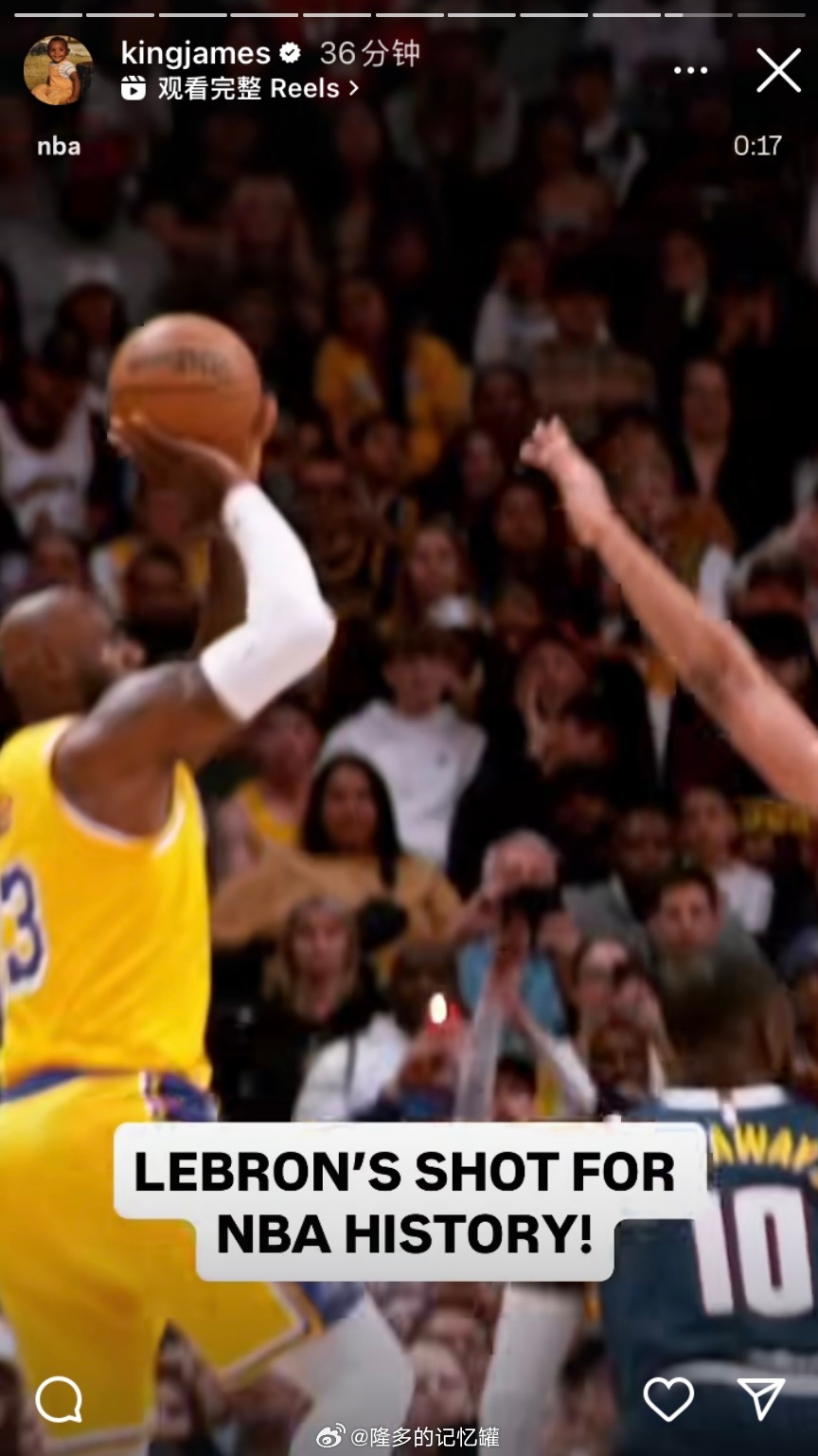 😯已到忘我境界!詹姆斯一口气更新六条IG限动,庆祝自己登顶历史进球榜,完全无视