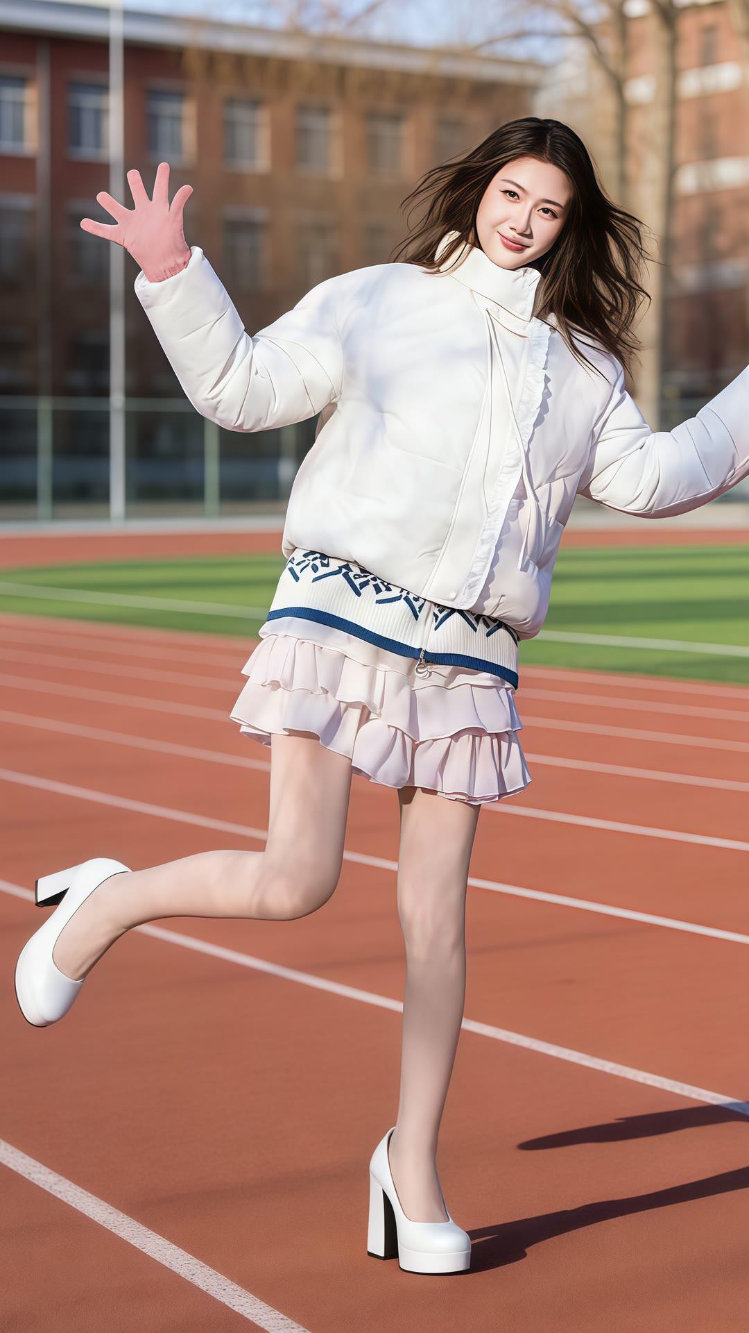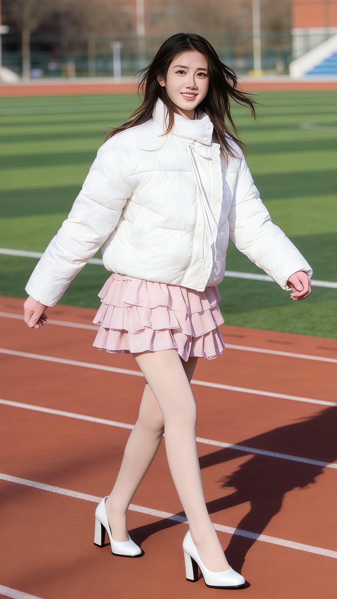 校园运动风穿搭,白色羽绒服搭配粉色百褶裙,活力满满!💃🏻👟