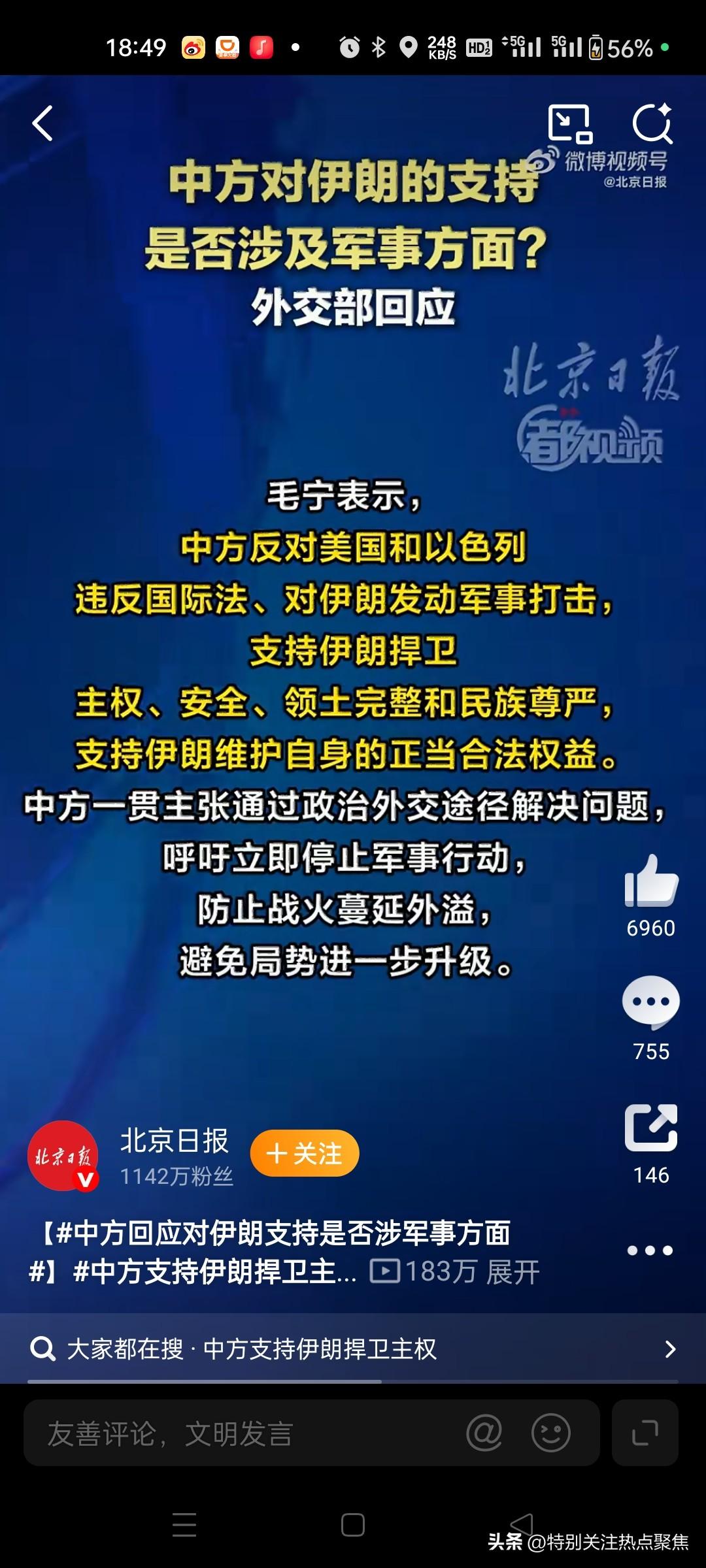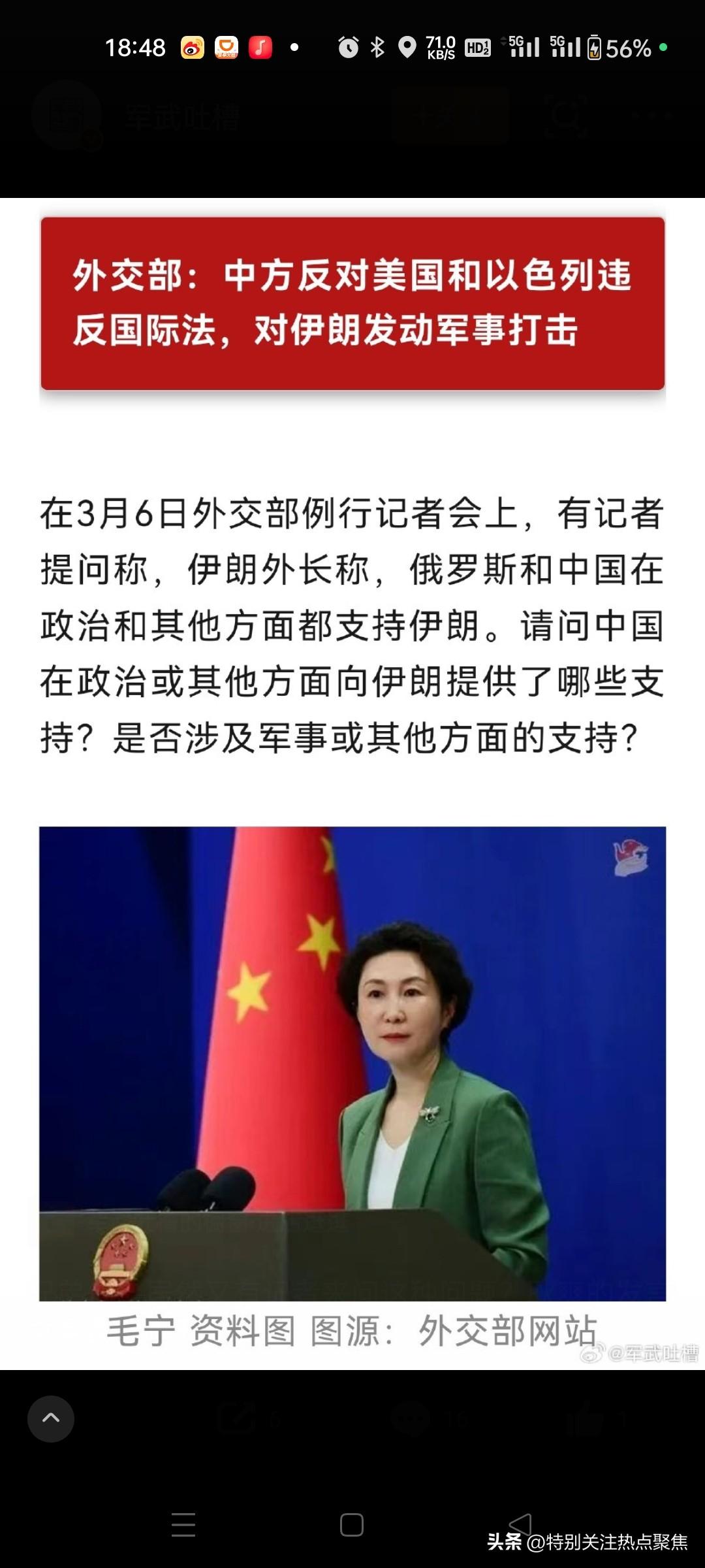 中方对伊朗的支持是否涉及军事方面? 中方对伊朗的支持明确不涉及军事领域,其核心是外交声援和政治支持,强调通过对话解决争端,反对任何外部军事干预。 一、官方明确立场:排除军事介入 外交部直接回应 2026年3月6日,外交部发言人毛宁在例行记者会上回应外媒提问时强调:中方反对美国和以色列违反国际法对伊朗发动军事打击,支持伊朗捍卫主权、安全和领土完整,但明确表示所有支持均通过政治外交途径实现,并呼吁立即停止军事行动。@北京日报 拒绝军售传闻 针对外媒炒作“中伊接近达成CM-302超音速反舰导弹采购协议”等军售猜测,外交部3月2日公开辟谣,称相关报道“不属实”。@多小衮多小衮 二、支持方式:聚焦外交与道义 联合国框架内行动 中方联合俄罗斯推动联合国安理会就伊朗局势召开紧急会议,提出三点主张: 立即停火止战,防止战火蔓延至整个中东; 敦促各方重回谈判桌; 反对单边军事行动和“丛林法则”。28 高层外交沟通 王毅外长与伊朗外长通话时,重申支持伊朗维护主权和民族尊严,但全程未提及军事援助,仅强调“停火止战”;@军机不可泄露6 中方在与以色列外长通话中,明确反对美以军事打击伊朗,要求以方保护中国在伊人员安全。@央视新闻4347新浪热点央视新闻 三、立场动因:战略利益与原则平衡 不干涉内政原则 中国常驻联合国代表多次强调,伊朗作为主权国家的事务应由其人民自主决定,反对任何外部武力干预。@CCTV国际...1923 地缘利益考量 能源安全:霍尔木兹海峡若被封锁可能引发全球油价飙涨,冲击中国能源供应链;@飞扬军事铁背...48 多边外交布局:中方需平衡与沙特等海湾国家关系,避免过度偏袒伊朗引发逊尼派国家不满;442 历史合作阴影:伊朗曾单方面取消中企基建、军购订单(如弃购歼-10C),削弱战略互信。@老王谈改革CCTV国际时讯中国新闻网CCTV国际时讯央视网飞扬军事铁背心高队老王谈改革 四、舆论与误读辨析 民间猜测与官方切割 部分网民主张对伊朗提供武器“震慑美国”,或猜测中方暗中提供技术支援(如导航信息、地堡建设)。但外交部及官媒均未认可此类说法,且耿爽名言“若中国真提供军援,战场局势不会如此”被广泛引用辟谣。@军武吐槽1534 伊朗表态的局限性 伊朗外长称“中俄在政治及其他方面支持伊朗”,但未提军事细节;中方则仅承认在联合国等多边平台提供外交支持。@中国新闻网7军武吐槽大弟子Leo中国新闻网 五、当前行动:危机管控优先 领事保护升级:2月底起,中方要求公民“暂勿前往伊朗”,并敦促在伊人员撤离,提供陆路撤离路线指南;@飞鱼Tech 能源通道保障:伊朗承诺对中国等“友好中立国”开放霍尔木兹海峡并安全护航,中方油轮仍可通行。4846 伊朗战略自卫 伊朗怒怼美国