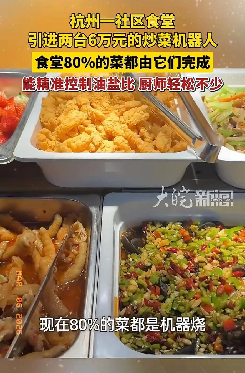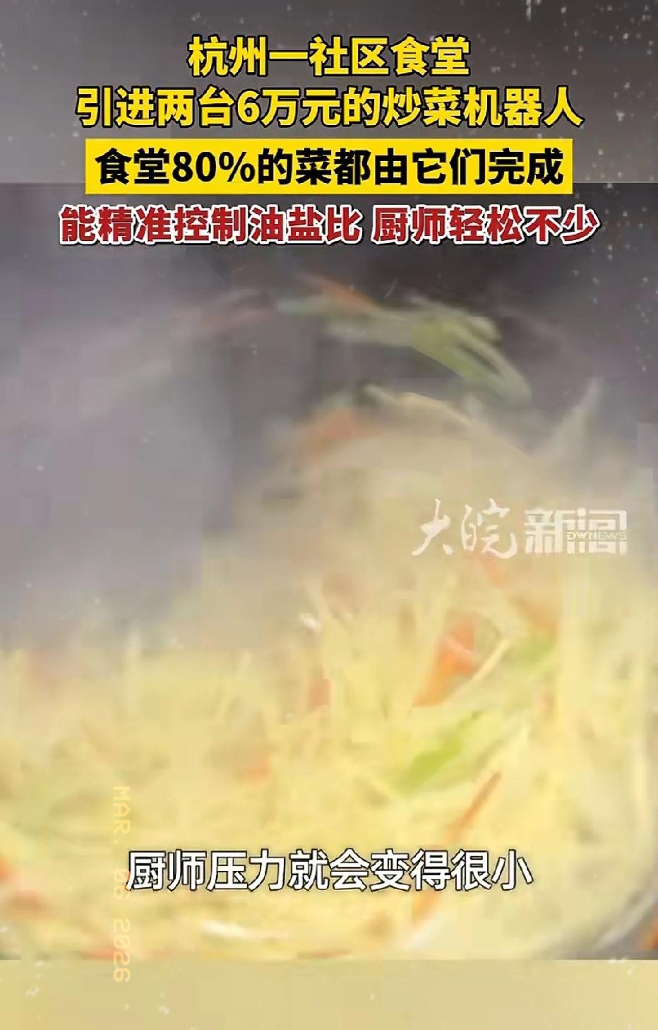 近日浙江杭州,一社区食堂里出现了2个神秘“大厨”,每天站在灶台前不停地翻炒,却从来不说话!更奇怪的是,来吃饭的大爷大妈反而越来越多了! 原来,这是社区花6万块钱引进的两台炒菜机器人。食堂里80%的菜都出自它们之手,从红烧肉到炒青菜,全自动完成。只见师傅把配好的菜倒进去,机器人就开始自己翻炒,火候到了还会自动提示。 最让大爷大妈们点赞的是,这机器人能精准控制油盐比例,每一道菜都是标准的少油少盐,再也不怕食堂师傅手一抖,酱油倒多了。 厨师也轻松了不少,笑着说:以前站一天累得腰疼,现在成了给机器人打下手的,轻松多了!就是偶尔会觉得有点无聊,毕竟连颠勺的机会都没了。 话说,你们愿意尝试这种机器人做的菜吗?能吃得出来是机器炒的还是人炒的吗?
