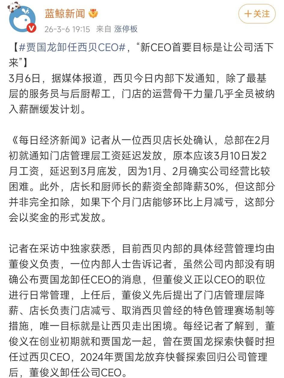 贾国龙最终还是卸任了西贝主品牌的CEO,不少人评论说,他这是把自己“作”下了台。 3月6日的媒体报道里,有个细节很戳人:春节前贾国龙就已经完成了卸任,接棒救场的,是西贝的前任CEO、跟着品牌走了三十多年的老将董俊义。 有西贝员工说得很实在:“董俊义更懂一线,他回来,人心会更稳一点。” 这话反过来听,其实就是:贾国龙在任的这段时间,人心是不稳的。 西贝走到今天这个局面,从来都不是一日之寒。 从之前和罗永浩的公开硬刚,到面对消费者的质疑始终不肯低头,贾国龙给外界的印象,始终是“头铁”、不肯认错。哪怕门店接连关停,员工收到待岗通知,他似乎也始终活在自己的节奏里,没觉得自己的决策出了问题。 有人拿李亚鹏的事件做对比,说同样是遭遇口碑危机,至少李亚鹏懂得低头服软,若是能拿出诚意做些实事,未必不能挽回口碑。但贾国龙选了最硬的那条路,一路刚到底,直到自己被换下。 更有意思的是,这次被请回来救场的,全是西贝的老臣。董俊义1992年就加入西贝,从后厨学徒一路做到CEO,另一位老将张忠其,也是从一线厨师成长起来的核心骨干。 兜兜转转一圈,最后能稳住局面的,还是懂一线、懂市场的老人。这恰恰说明,这些年身居高位的贾国龙,已经离一线的真实声音,越来越远了。 很多人说他是被迫卸任,其实想想就明白,没有哪个创始人愿意主动交出经营大权。能走到这一步,背后一定是无数次“不听劝”的决策,攒下了无法挽回的局面。 只是最让人唏嘘的,还是那些普通的员工。老板的固执与任性,最终的代价,却落到了他们头上——待岗、被优化,要为别人的错误重新奔波。 企业经营遇到危机并不可怕,可怕的是身处危机之中,却始终闭着眼不肯承认自己的问题,活在自己的世界里。 当你听不进市场的声音、看不见员工的难处时,最终被市场淘汰,不过是迟早的事。