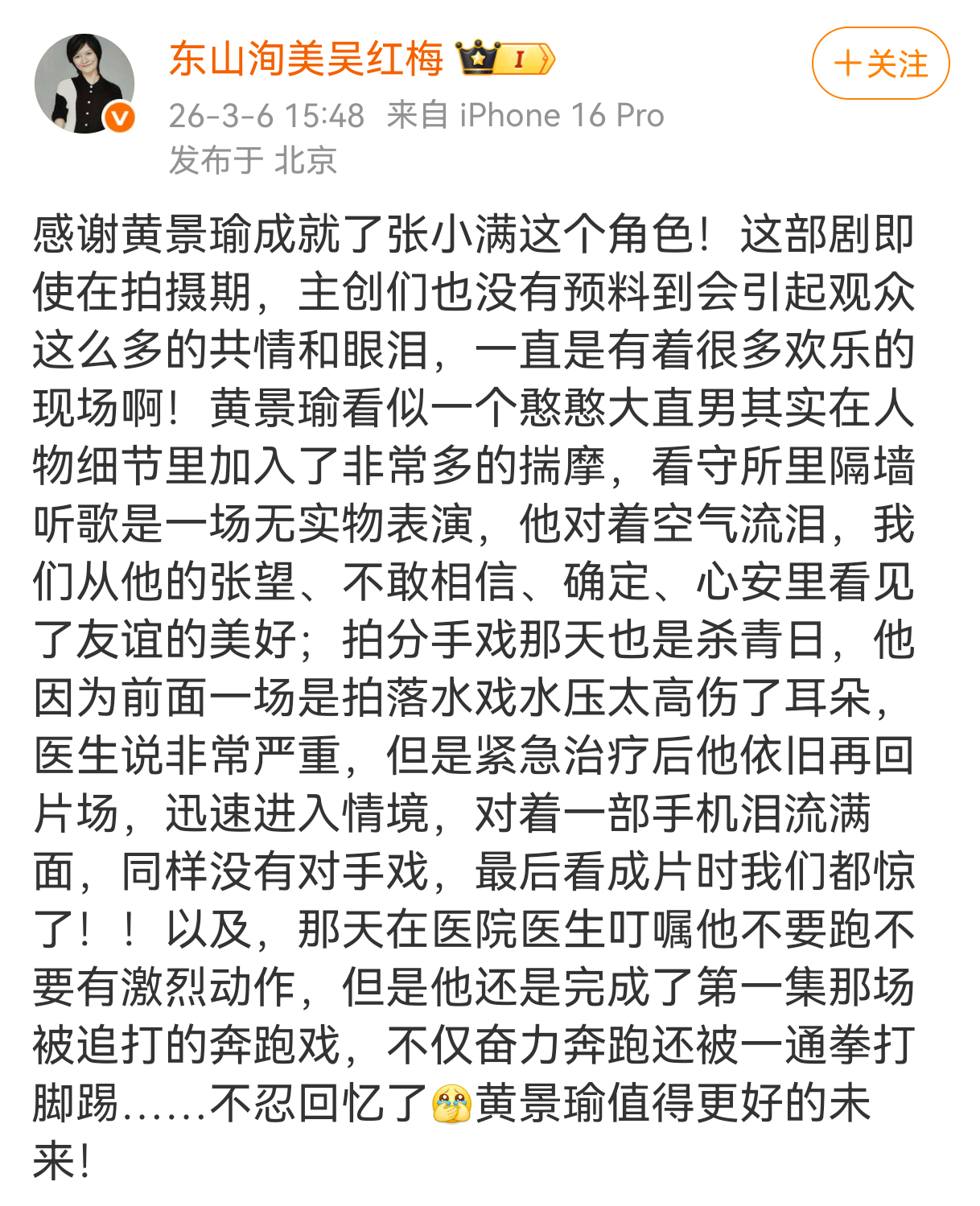 黄景瑜︱《岁月有情时》︱制片人评价制片人对黄景瑜演技和对他在这个角色上投注的心血给予极高的肯定定档时我曾经因为制片人在宣发和档期的问题上让我觉得能力不行而发过一次脾气,但也就那一次,后来对这部剧对张小满这个角色我全是满意和惊喜,今日收官我要再说一次:张小满完全是人生角色,在有限的条件下,没有任何遗憾!开播后我看完首更4集就很满意,这部剧制作精良,画面充满复古美感,导演节奏感好镜头语言细腻又老练,而且还非常会拍黄景瑜,剧情紧凑,每一集信息量巨大,戏剧冲突和角色的拉扯也非常有看头,是那种会让所有人产生共鸣,激起讨论的写实和接地气,浓浓人情味儿和东北独特的苦中作乐幽默感,让我每一集都又哭又笑黄景瑜这个角色的演绎不仅是他演爽了,我也看爽了,演技台词打通任督二脉一般飞跃这部剧的命运就像张小满一样,在没有任何幸运buff的情况下,在宣发预算极其有限的情况下,已经超出我的预期了!岁月有情时收官