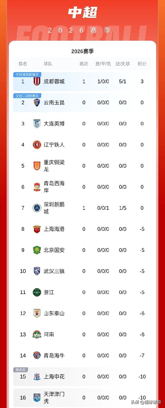 中超提前大结局了?成都蓉城揭幕战5-1大胜深圳新鹏城领跑积分榜! 今晚中超新赛季迎来了揭幕战,成都蓉城坐镇主场5-1大胜深圳新鹏城,领跑中超积分榜。 本赛季的中超比较特殊,由于足协的处罚让不少豪门球队开局就是负分,上海申花-10分,山东泰山-6分,北京国安-5分,上海海港-5分,因此上赛季的亚军成都蓉城赢下揭幕战后直接领先争冠球队至少8分了,可以说新赛季刚开始就提前大结局了。 深圳新鹏城虽然输球而且净胜球是-4,但是却力压各大豪门球队排名第七,可以说没有一点降级压力了。 不得不说本赛季的中超真的是前所未见,放眼欧洲联赛也是闻所未闻了,不过这样也也更有看点了,就看是成都蓉城占据天时地利趁机夺冠,还是被扣分的豪门球队逆天改命了。