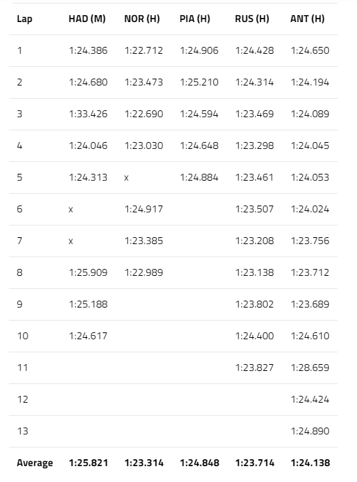 迈凯伦使用硬胎进行了较短的长距离测试,诺里斯的速度比拉塞尔快,但他的长距离测试分为两部分,一部分在练习赛开始时进行,另一部分在接近结束时进行,因此这也无法真实反映其长距离表现。皮亚斯特里也在练习赛接近结束时进行了短距离测试。