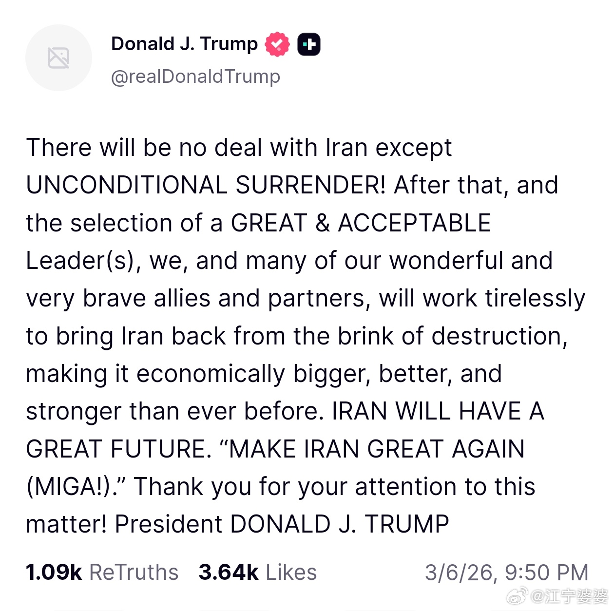 哇川皇又放狠话了伊朗唯一的选择就是♦无条件投降♦!(全大写加粗)