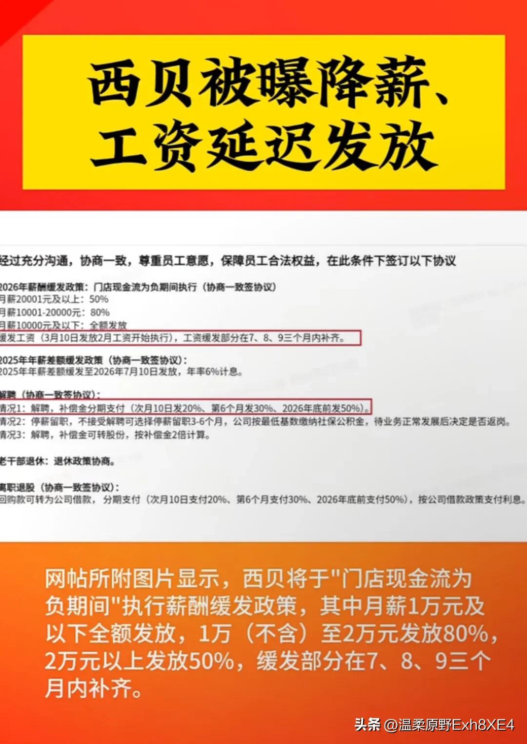 谁能想到,去年1月份完成A轮融资、优化完股权结构,马上就要上市的一家大型企业,能因为一场预制菜风波,濒临破产、命悬一线! 没错,就是西贝。据悉,西贝最近除了大量关闭门店,总部原超500名员工也将裁至200余人。 老贾春节前卸任CEO,亲自奔赴一线也没能挽回局势。现在也不装了,公司裁人,给出了三种方案: 1,停薪留职 2,公司发放2025年的部分绩效,员工收到后主动离职。 3,按照“N”倍补偿解聘,但补偿金需分期一年支付,也可能以“转股份”形式解决。 可这些方案怎么看,员工都挺亏的。有网友就说,老贾就像是外行来捣乱的!赚钱吹牛的时候不替员工想想,不赚钱了第一时间让员工降薪、离职。 唉,新的一年里,找工作千万别找太自负傲娇的老板了,不顾员工死活,太能“自残”了!市场可不需要一个老登来教育消费者[捂脸]! 您觉得呢? (信息源:36氪)