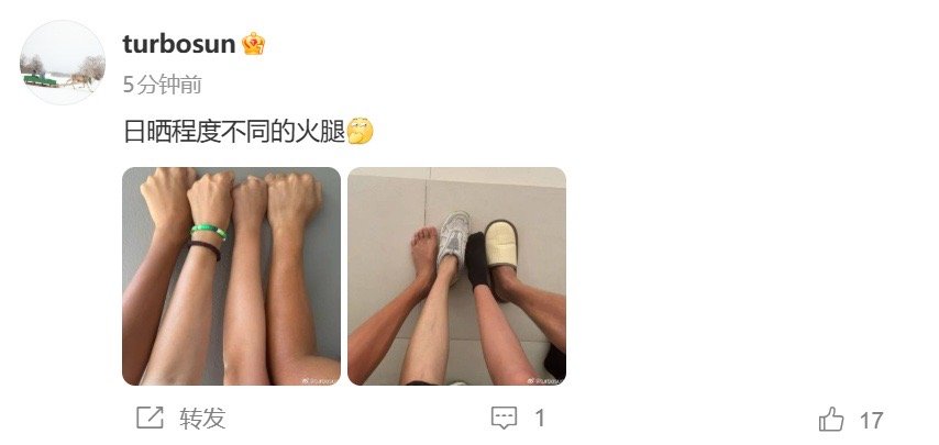 孙俪晒一家人肤色差孙俪 日晒程度不同的火腿 孙俪晒出一家人的肤色差,并配文:“日晒程度不同的火腿”。太有趣了!