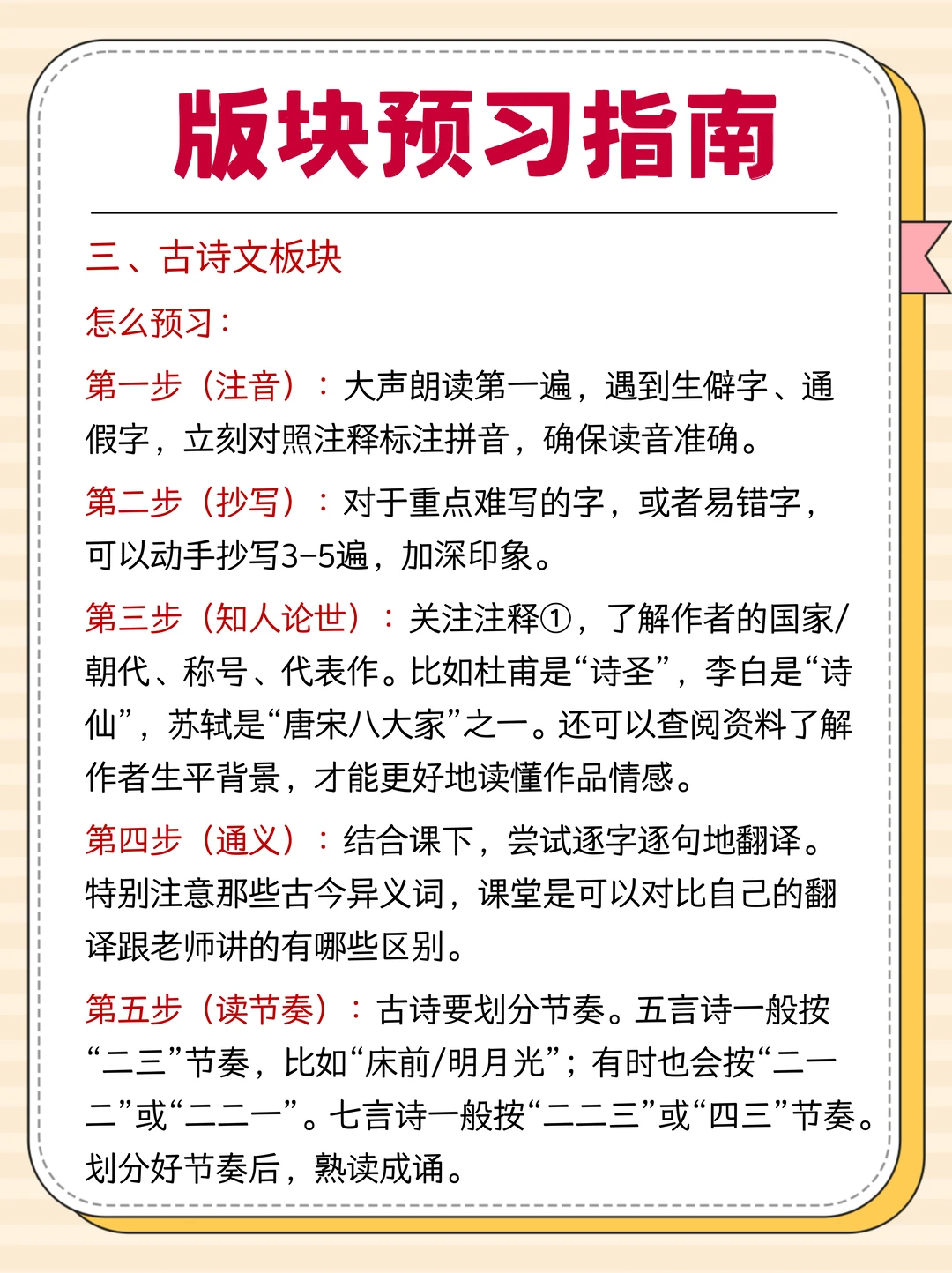 📜古诗文:朗读注音 + 抄易错字 + 了解作者背景 + 逐句翻译 + 划分节奏熟读