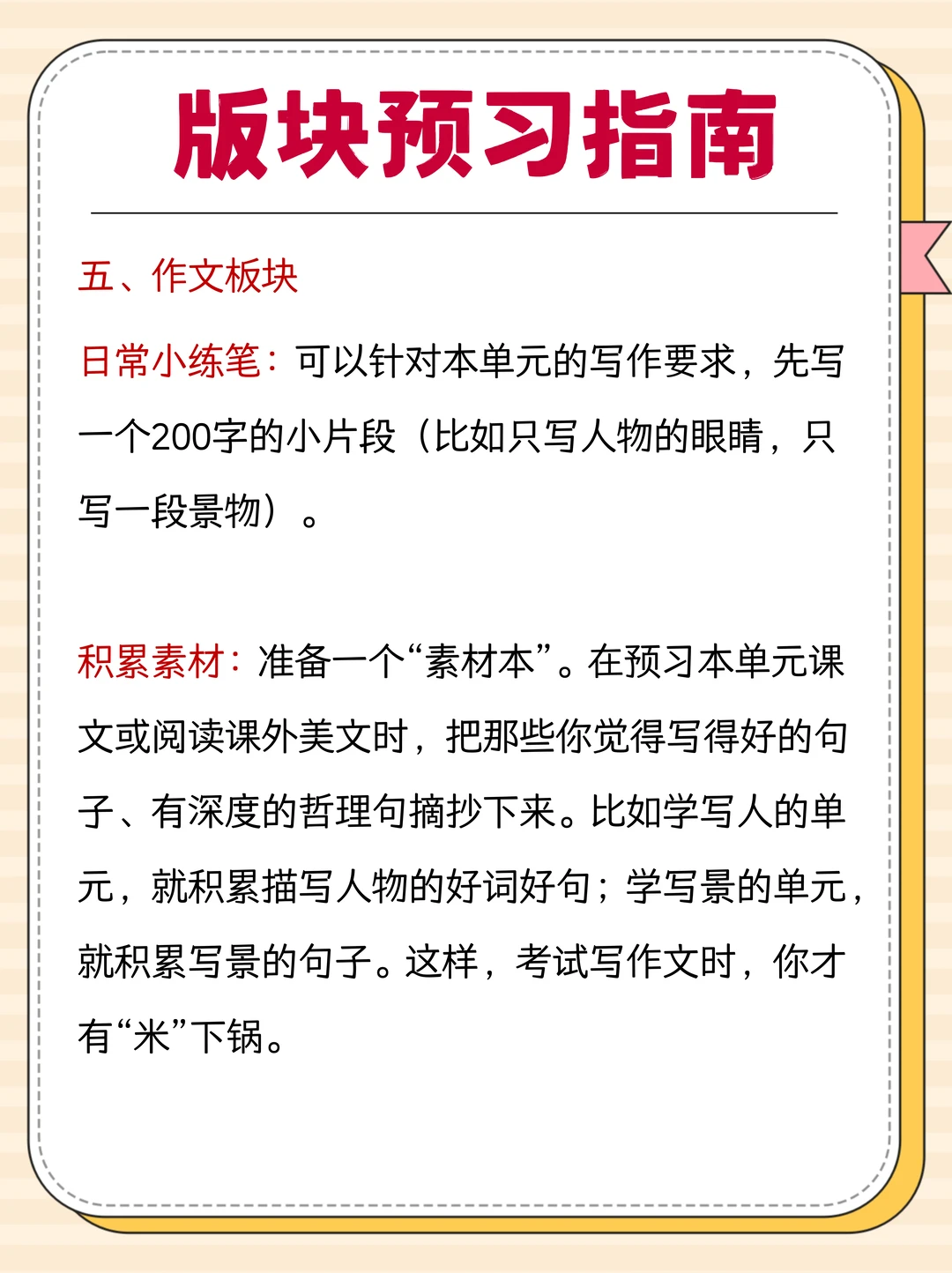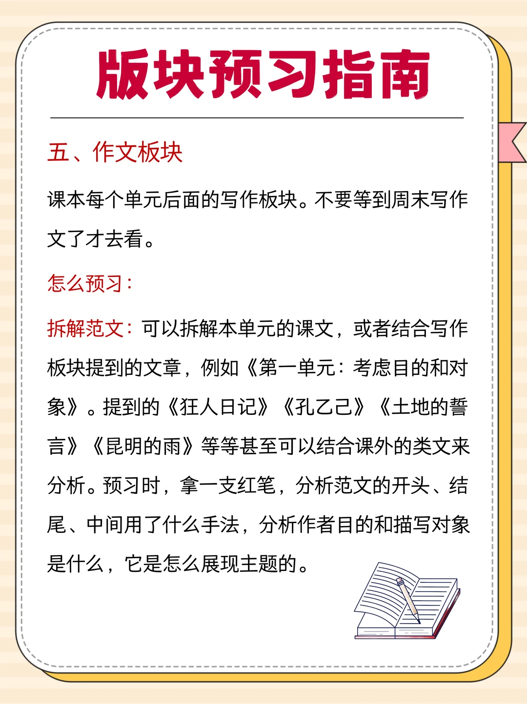 ✍作文:拆解本单元的课文,或结合写作板块提到的文章,分析范文的开头结尾,针对性练 200 字小片段,积累对应主题的写作素材