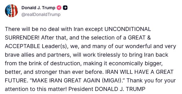 特朗普又发帖了:“除了无条件投降,不会与伊朗达成任何协议!”