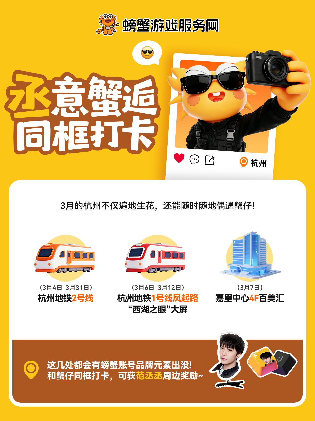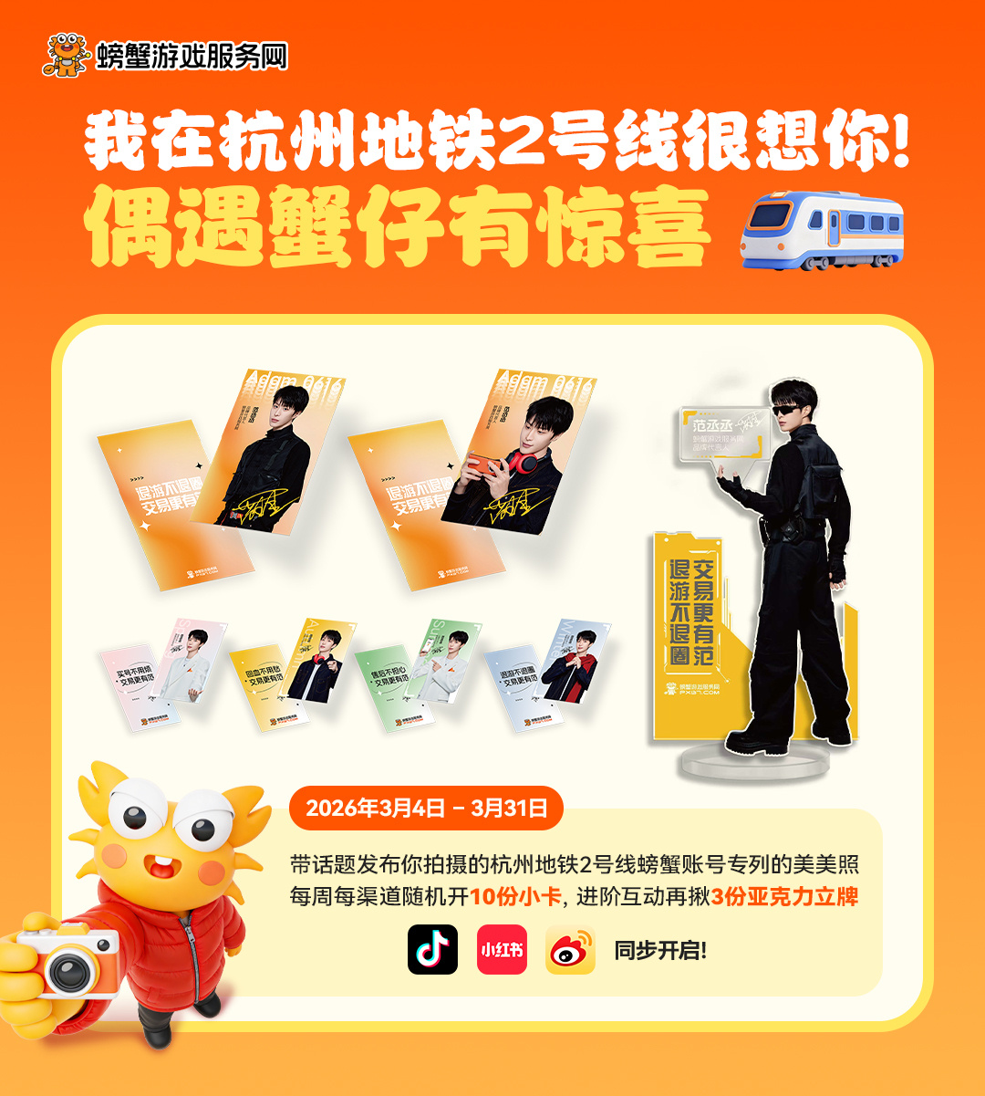 在杭州被螃蟹账号硬控螃蟹账号太宠我们代言人范丞丞啦!3月宠粉福利层出不穷,为范丞丞打造超盛大应援!螃蟹账号在杭州2号线主题地铁、凤起路“西湖之眼”大屏、嘉里中心百美汇影院布置三大打卡点,参与打卡发帖便有机会被官方翻牌,赢范丞丞小卡、立牌!此外,3月7日螃蟹账号杭州包场飞驰人生,在百美汇影院参与活动还能领取惊喜周边,打卡拍照更出片!别光羡慕杭州的丞星啦,线上活动福利同样一轮接一轮!3月5日起进站搜索【螃蟹女神季】,大疆相机、范丞丞亲签、范丞丞周边、游戏大额券等好礼任性抽,还能参与观影城市打榜赛,为自己的城市助力冲《飞驰人生3》包场~优质代言人与实力品牌的双向奔赴,这波应援哪个丞星不心动?!为丞丞打call我必须全力以赴,好运一定轮到我!🤩螃蟹账号官宣代言人范丞丞 范丞丞 退游不退圈交易更有范 螃蟹道具为热爱充值 螃蟹游戏服务网 螃蟹账号