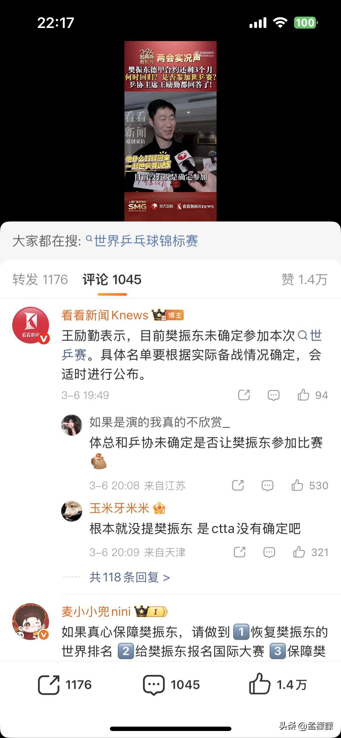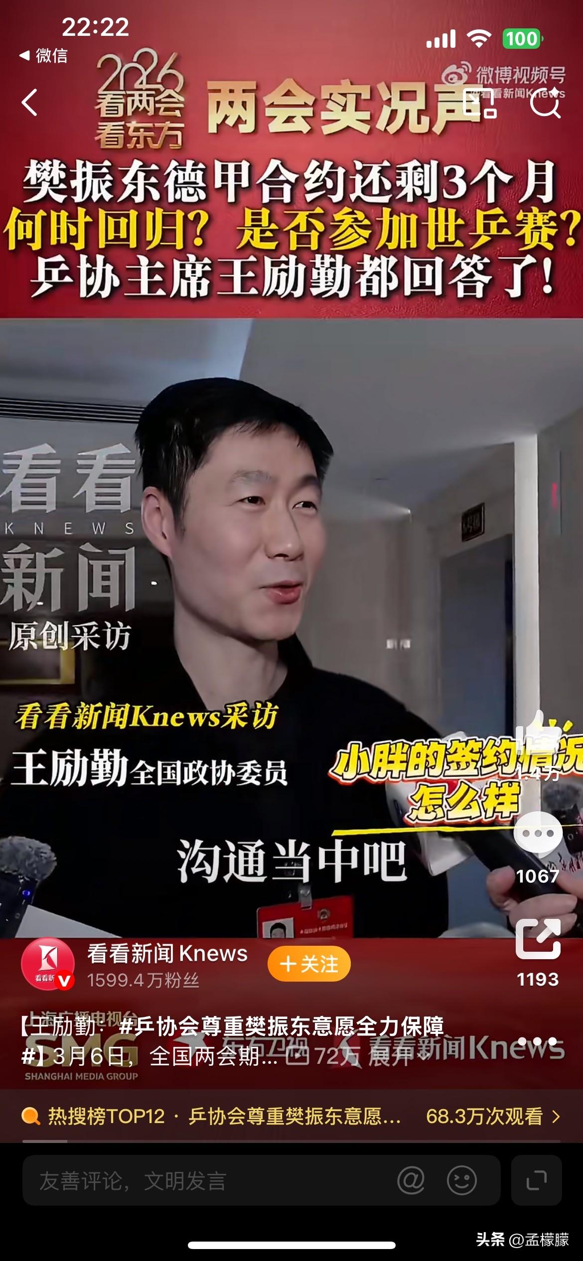 【王励勤表示,目前樊振东未确定参加本次伦敦世乒赛】 3月6日,全国两会期间,全国政协委员、中国乒协主席王励勤在接受看看新闻Knews 记者采访时表示,针对他的签约情况,目前还在跟樊振东 本人进行沟通,但是中国乒协会尊重个人意愿,全力以赴做好相关保障工作。 2026年国际乒联伦敦世界乒乓球锦标赛团体赛即将到来,王励勤表示,“目前樊振东未确定参加本次世乒赛。根据选拔办法的要求,相关运动员有的符合直接参赛资格,剩下的还要经过队内选拔和教练综合评估决定,具体名单要根据实际备战情况确定,我们会适时进行公布。”王励勤说正和樊振东沟通回归国家队 按照国乒 伦敦世乒赛选拔办法,樊振东凭借全运会男单冠军可以入围国乒伦敦世乒赛阵容。 乒乓球 樊振东