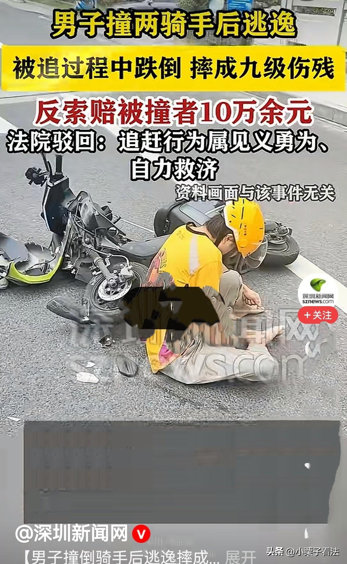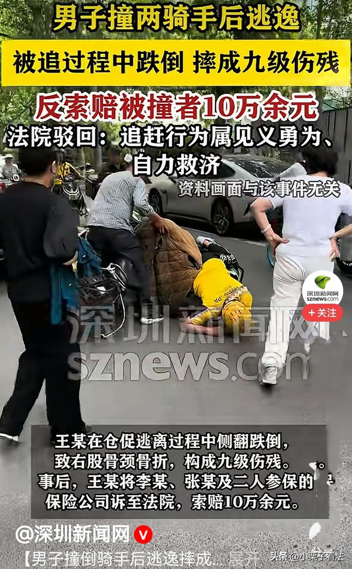 大快人心!江苏泰州,一外卖员正常骑着二轮电动车按路线送餐,突然被一骑三轮电动车男子撞倒后逃逸,这事被另外一外卖员看到,他出于正义,骑车追男子让他停下。被撞的外卖员也忍痛爬起,骑上车去追肇事男子。男子慌不择路,从非机动车道左拐进入机动车道,不慎侧翻跌倒受伤。诊断为右股骨颈骨折,鉴定构成九级伤残。事后男子将两位外卖员及二人参保的两家保险公司诉至法院,要求被告赔偿各项损失合计10万余元,法院判决亮了! 2024年的一天,外卖员李某正骑着电动二轮车按路线送餐,一切都和往常一样平静。 谁也没想到,一场突如其来的意外,会牵出一场让人哭笑不得的官司。 当天,男子王某驾驶着一辆无牌电动三轮车,在道路上行驶时注意力不集中,径直撞上了正常骑行的李某。 巨大的冲击力让李某连人带车摔倒在地,身体传来阵阵剧痛,电动车也被撞得歪在一边。 谁知,王某瞥了一眼倒地的李某,脚踩油门径直驾车逃逸,丝毫没有停留的意思。 这一幕,恰好被途经此处的另一位外卖员张某看在眼里。 张某常年在路上跑单,最见不得这种肇事逃逸的行为,看着王某扬长而去的背影,他心里的正义感瞬间涌上心头。 他来不及多想,立刻调转车头追了上去,一边追一边大声呼喊,让王某停车接受处理。 另一边,李某强撑着身体的疼痛从地上爬起来,看着肇事者逃之夭夭,又气又急。 自己好好骑车被撞,对方不仅不道歉赔偿,还直接跑了,这口气实在咽不下去。 他顾不上身体的不适,扶起电动车也加入了追赶的队伍,一心想追上王某,为自己讨个公道。 王某在前面慌不择路地逃窜,身后两位外卖员紧追不舍,他心里又慌又怕,只想快点摆脱追赶。 为了尽快逃离,他不顾交通规则,仓促地从非机动车道猛地左拐驶入机动车道。 机动车道上车速更快、路况更复杂,王某的操作本就慌乱,加上电动三轮车车身不稳,刚拐进去没多久,车辆就失去平衡。 他当场侧翻在地,王某也重重摔在路面上,疼得动弹不得。 看到王某摔倒,李某和张某没有丝毫犹豫,立刻停车上前查看,第一时间拨打了报警电话,还守在现场保护好事故痕迹,全程没任何过激举动,尽到了应有的责任。 经医院检查治疗,王某被诊断为右股骨颈骨折,后续经司法鉴定,构成了九级伤残。 这本是他自己肇事逃逸、违规驾驶造成的后果,可王某却不这么想。 他觉得,要不是李某和张某追赶自己,自己根本不会摔倒受伤,这笔账必须算在他们头上。 不久后,交警部门出具了事故认定书:第一次撞人事故,王某负全部责任。 第二次侧翻事故,认定王某、李某、张某三方负同等责任。 拿到认定书的王某,像是抓住了“救命稻草”,一纸诉状将李某、张某以及两人参保的两家保险公司告上了法庭。 要求赔偿医疗费、伤残赔偿金等各项损失共计10万余元,还要求保险公司在责任范围内承担赔偿责任。 法庭上,王某振振有词,坚称自己受伤是被两人追赶所致,要求赔偿合情合理。 李某和张某既委屈又气愤,他们只是制止肇事逃逸、维护自身权益,怎么反倒成了被告? 法院经过细致审理,没有被交警的事故认定书局限,而是将撞人、逃逸、追赶、侧翻看作一整个连续事件,厘清了其中的是非曲直。 《道路交通安全法实施条例》第92条:发生交通事故后当事人逃逸的,逃逸的当事人承担全部责任 。 法官明确指出,交警的事故认定不等同于民事责任划分,民事侵权赔偿需要满足违法性、过错、因果关系三个核心要件。 王某的受伤,完全是他自己一手造成的。他无牌驾驶、撞人逃逸,为了逃跑违规变道,对自身损害存在重大过错。 《民法典》第184条:因自愿实施紧急救助行为造成受助人损害的,救助人不承担民事责任 。 而张某挺身而出追赶逃逸者,是见义勇为的正义之举,不承担民事责任。 《民法典》第8条:民事主体从事民事活动,不得违反法律,不得违背公序良俗。 李某追赶肇事者,是维护自身合法权益的自力救济,两人的行为既不违法,也没有超过必要限度,全程没有任何侵权故意和过失。 更关键的是,王某摔倒受伤,是他自己危险驾驶、慌不择路的直接结果。 即便没有两人追赶,他的违规操作也极易引发事故,两人的追赶和他的受伤之间,根本不存在法律上的因果关系。 法院还严肃指出,诚信友善是基本的道德准则,王某肇事逃逸逃避责任,既违法又违背公序良俗,理应受到批评。 而两位外卖员的行为,彰显了正义与担当,符合社会主义核心价值观,应当得到鼓励和支持。 最终,法院作出硬核判决:驳回王某的全部诉讼请求,案件受理费、鉴定费全部由王某自行承担。 对此您怎么看?