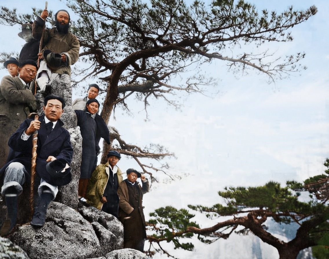 这张照片,记录了1936年春,中国近现代画坛的两位巨匠——徐悲鸿与张大千,在黄山之巅的一次巧遇。 照片左下方是时任南京中央大学艺术系教授徐悲鸿,正带领学生赴黄山写生,他身着西装,手持拐杖,是这次写生活动的组织者。照片左上方是张大千,当时受聘于中央大学,正与画家谢稚柳等人第三次游历黄山,他标志性的长髯和登山装束,在人群中十分醒目。照片中其他的人,是徐悲鸿带领的中央大学艺术系学生,以及张大千的随行友人。 1936年,张大千携谢稚柳游黄山,在山脚下恰好遇到了带领学生写生的徐悲鸿。两位大师欣然结伴同行,共同攀登险峰,在黄山的云海松涛间留下了这张合影。
