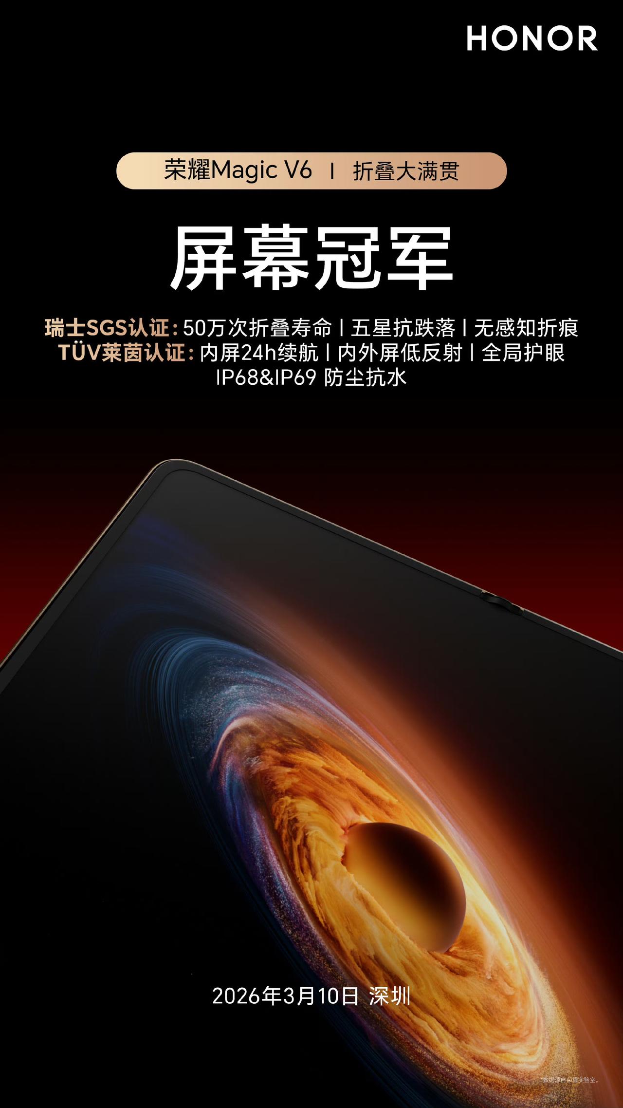 这次Magic V6让我意识到:荣耀的护城河,不止于轻薄和续航,可靠性才是隐藏的王牌。 以前用折叠屏总得小心翼翼,现在V6直接拉满防护——行业首发2800MPa盾构钢(比汽车A柱还硬),独家黑钻屏拿下五星抗跌落认证,IP68/IP69双防尘防水,甚至能水下弯折。 但荣耀的底牌显然还没出完。3月10日,蹲一个更大惊喜。 荣耀折叠屏铰链材料强度超汽车A柱