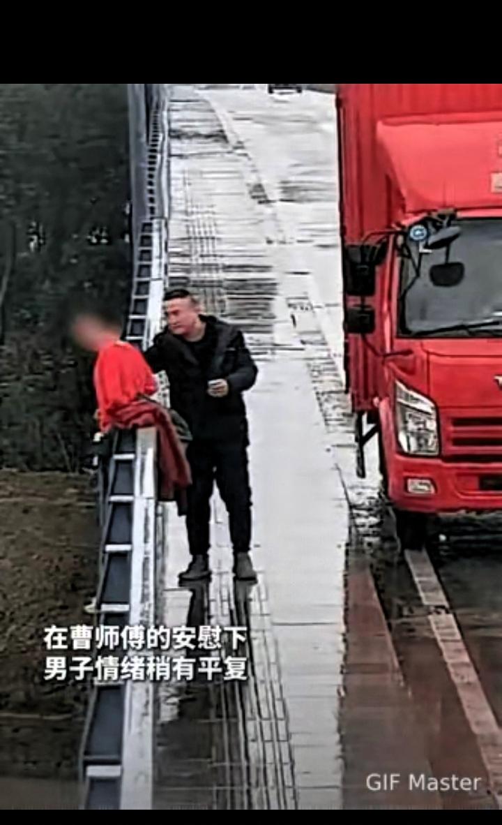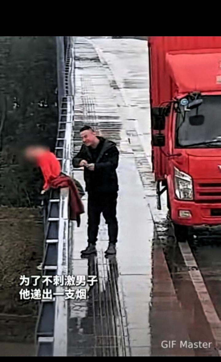 一根烟,一双手,一个陌生人,硬生生把一条命从鬼门关拉了回来 面对情绪低落的当事人,司机没有进行生硬说教,也没有指责对方,而是先递上一根烟,以平和的方式缓解对方的情绪。在交流过程中,他找准时机,及时上前抱住当事人,避免了意外发生。 成年人在面对压力和困境时,容易出现情绪崩溃,生硬的道理往往难以起到作用。这位司机用温和、接地气的方式靠近对方,给予尊重与安慰,这种方式更容易让人接受。 在他人陷入困境时,选择上前帮助,而不是冷漠旁观,体现了普通人最朴素的善良与责任感。他的行为没有惊天动地的场面,却在关键时刻挽救了一条生命,也守护了一个家庭。 善意不一定要轰轰烈烈,很多时候就体现在这样冷静、果断、体贴的行动里。不随意评判,不袖手旁观,在力所能及的范围内拉别人一把,就是最实在的善良。 这件事也提醒我们,生活中遇到难处时,别轻易放弃。总有人在默默关心、愿意伸出援手,再坚持一下,也许就能看见转机。 愿被救者能够调整心态,好好面对以后的生活,不辜负这次被救下的机会。也愿这位心地善良的货车司机,出行平安,生活顺利。 陌生人之间的温暖,最能让人感受到生活的善意。