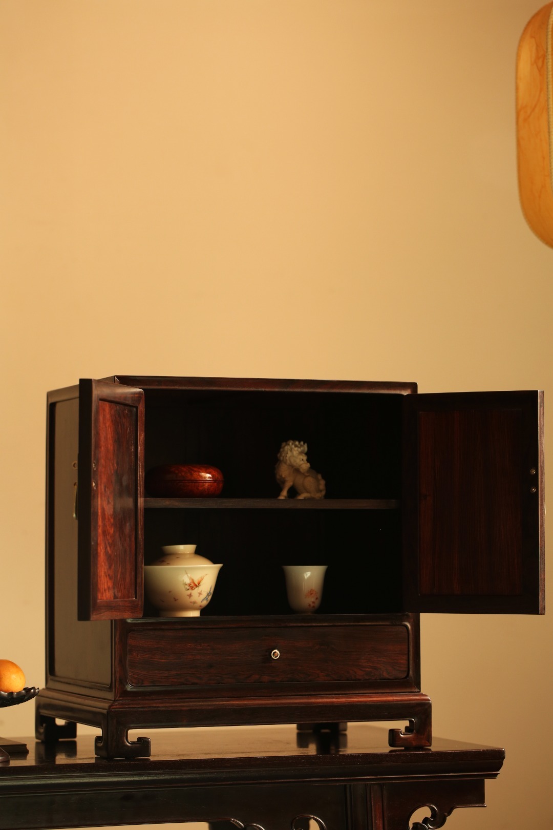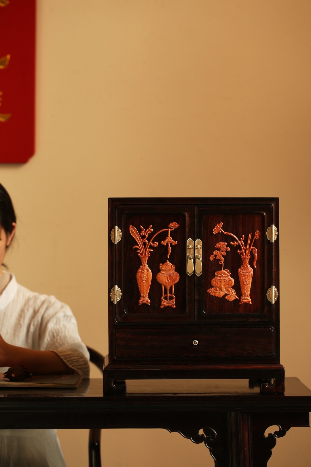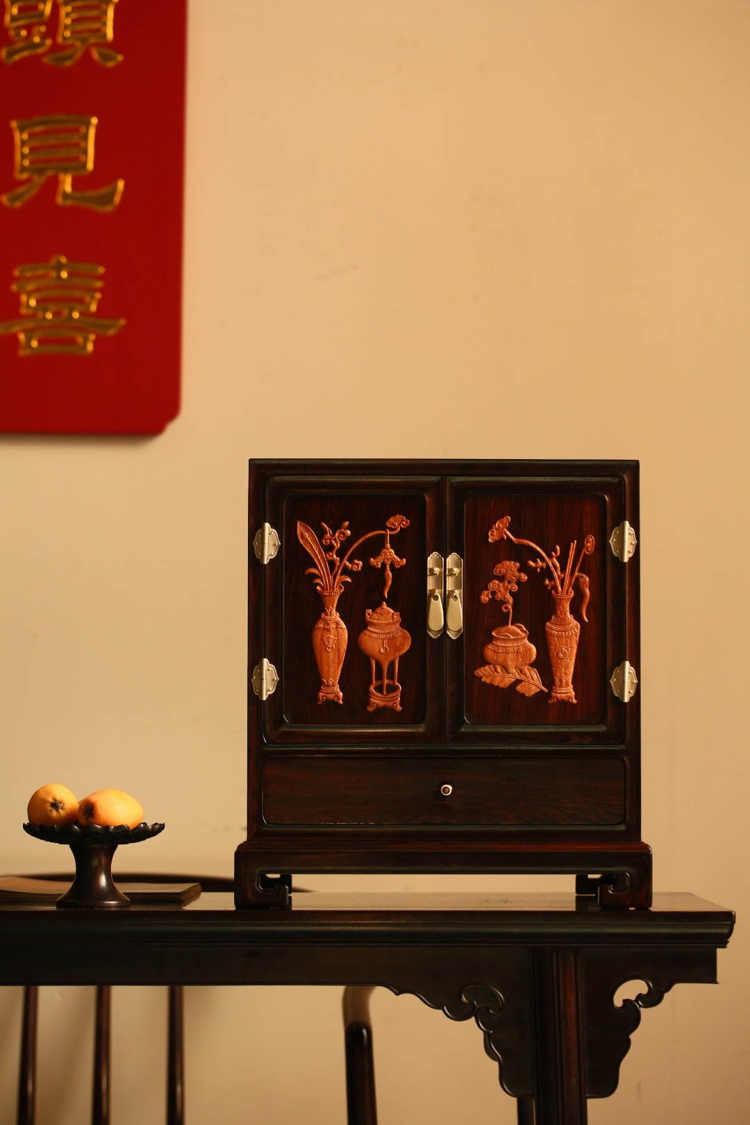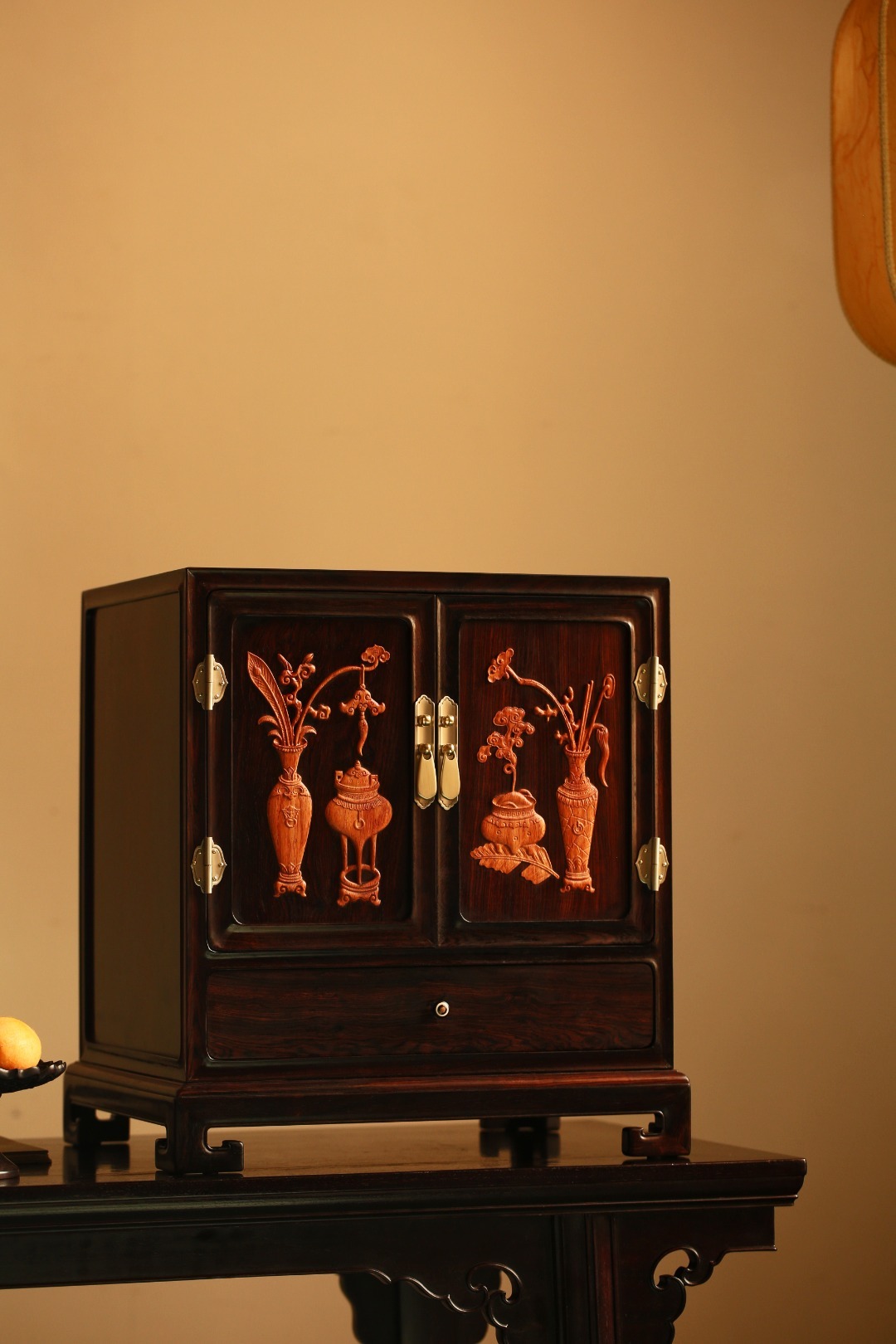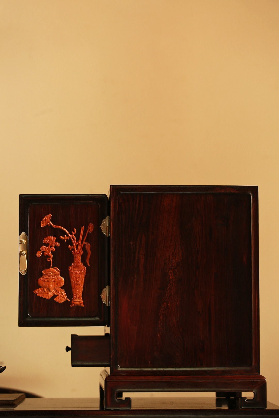 形制端庄,平开对门下设抽屉,空间足,收纳有序,整器极具美感。 面嵌缅花饰清供图, 雕工精细,古韵雅致。