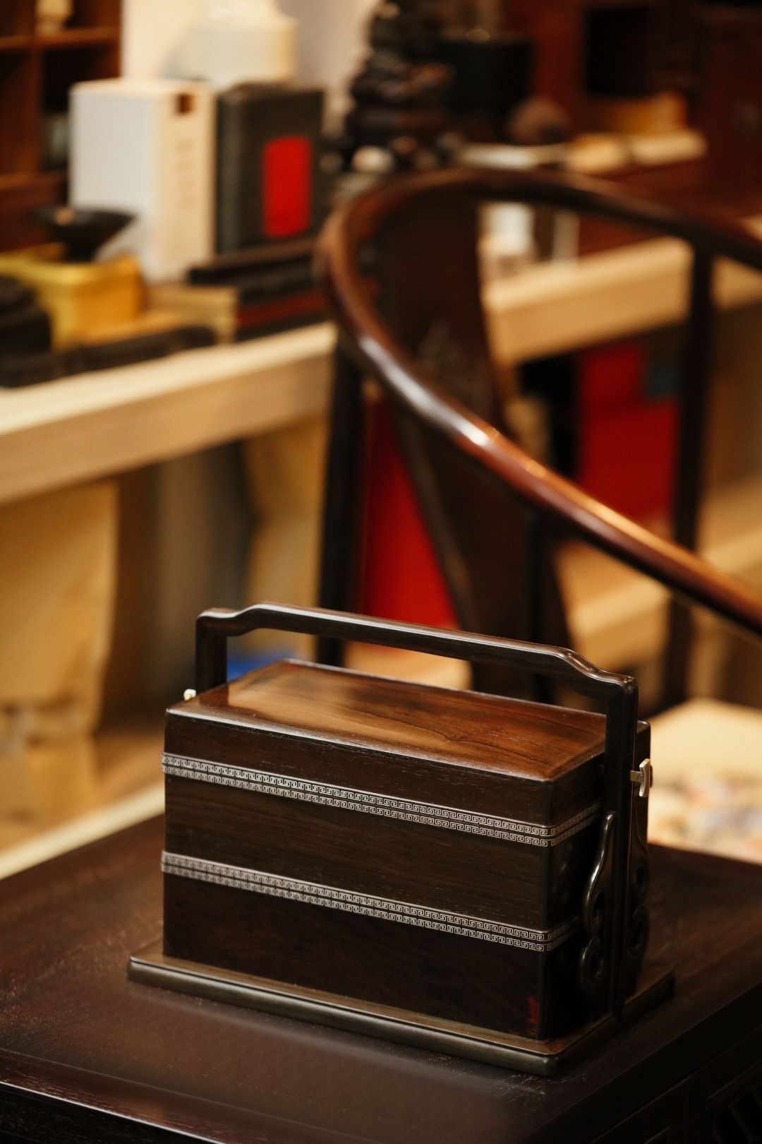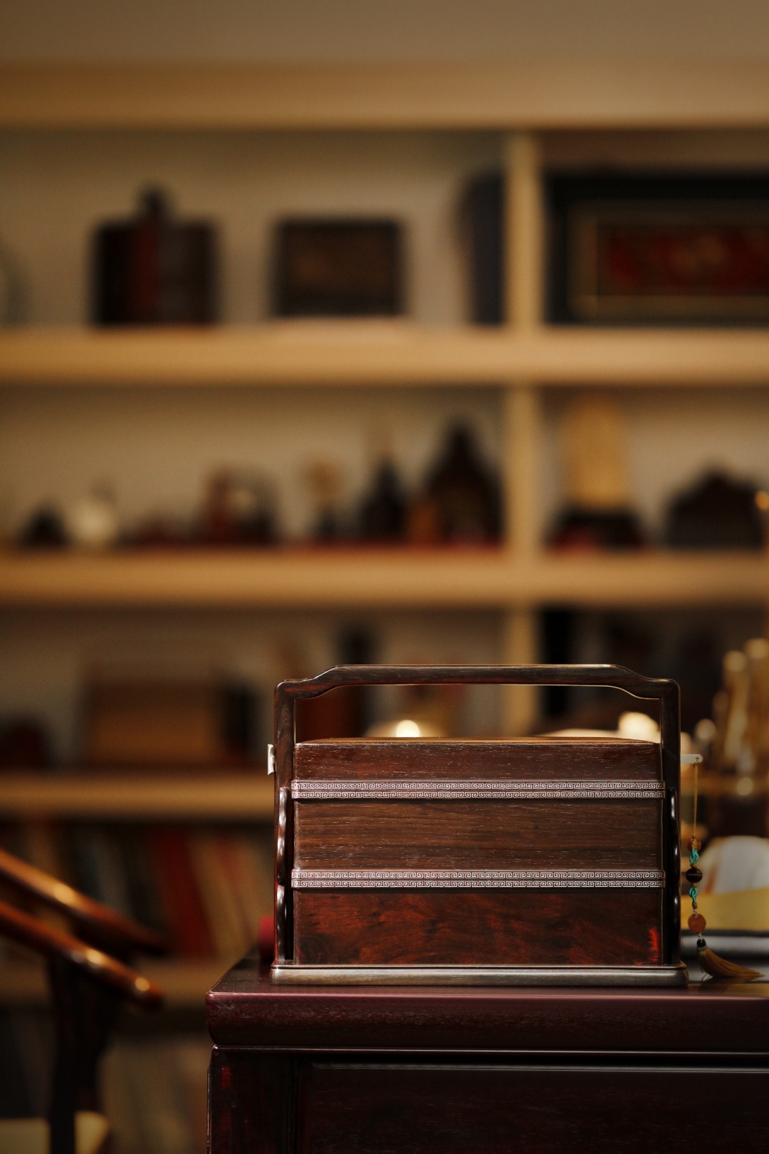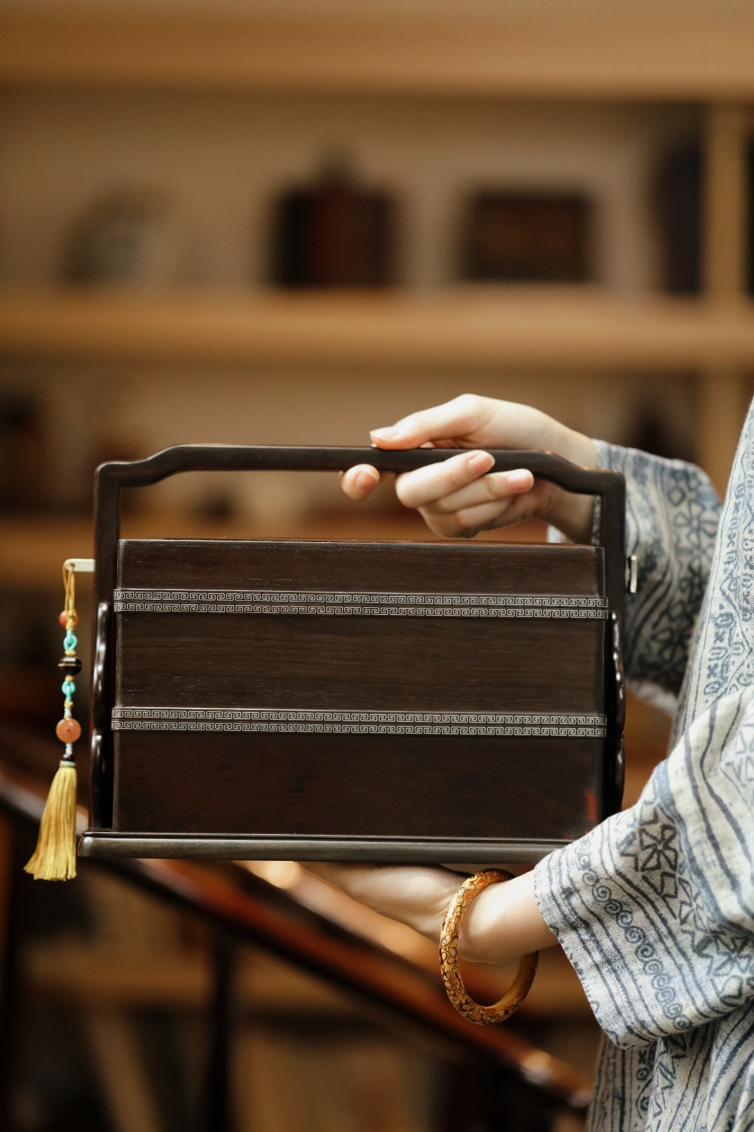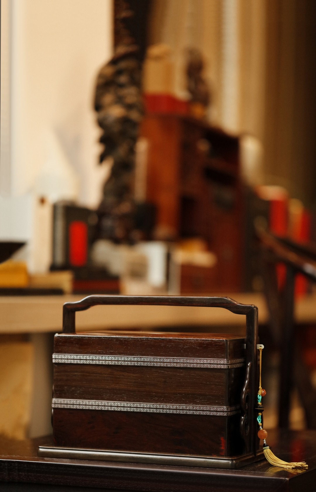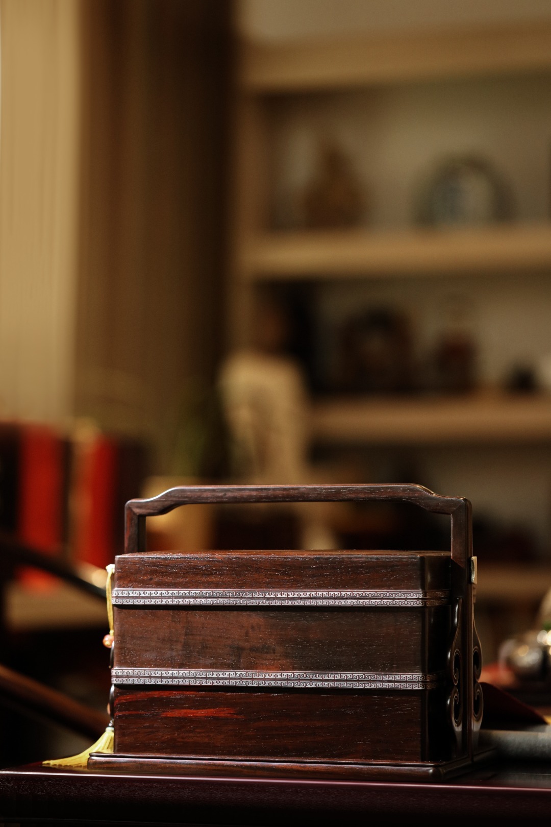 大红酸枝 | 提盒黑红老料制,器型考究;镶嵌银丝作如意纹,古典雅致,收纳零食、茶