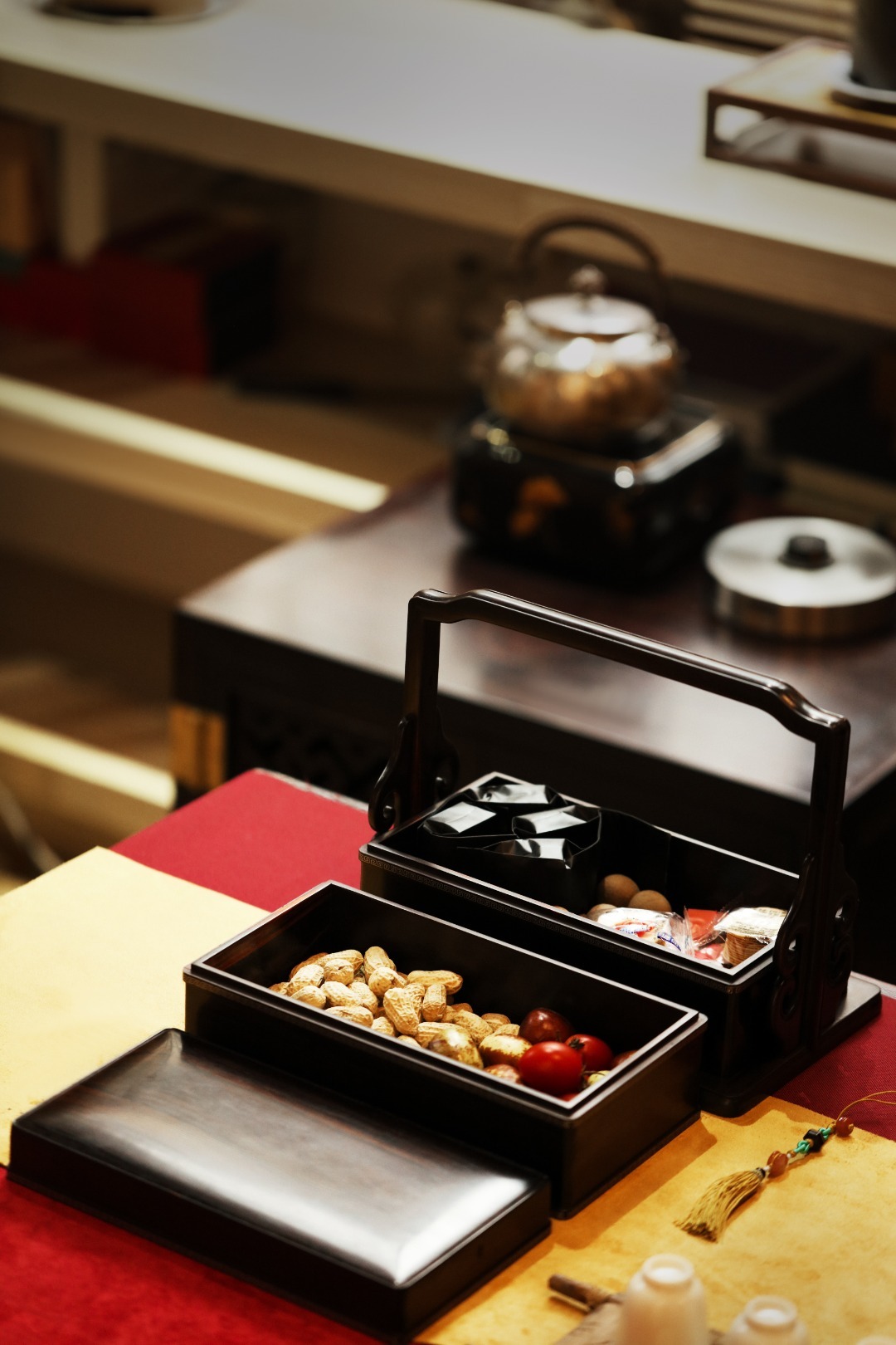 黑红老料制,器型考究;镶嵌银丝作如意纹,古典雅致,收纳零食、茶叶,美观实用。