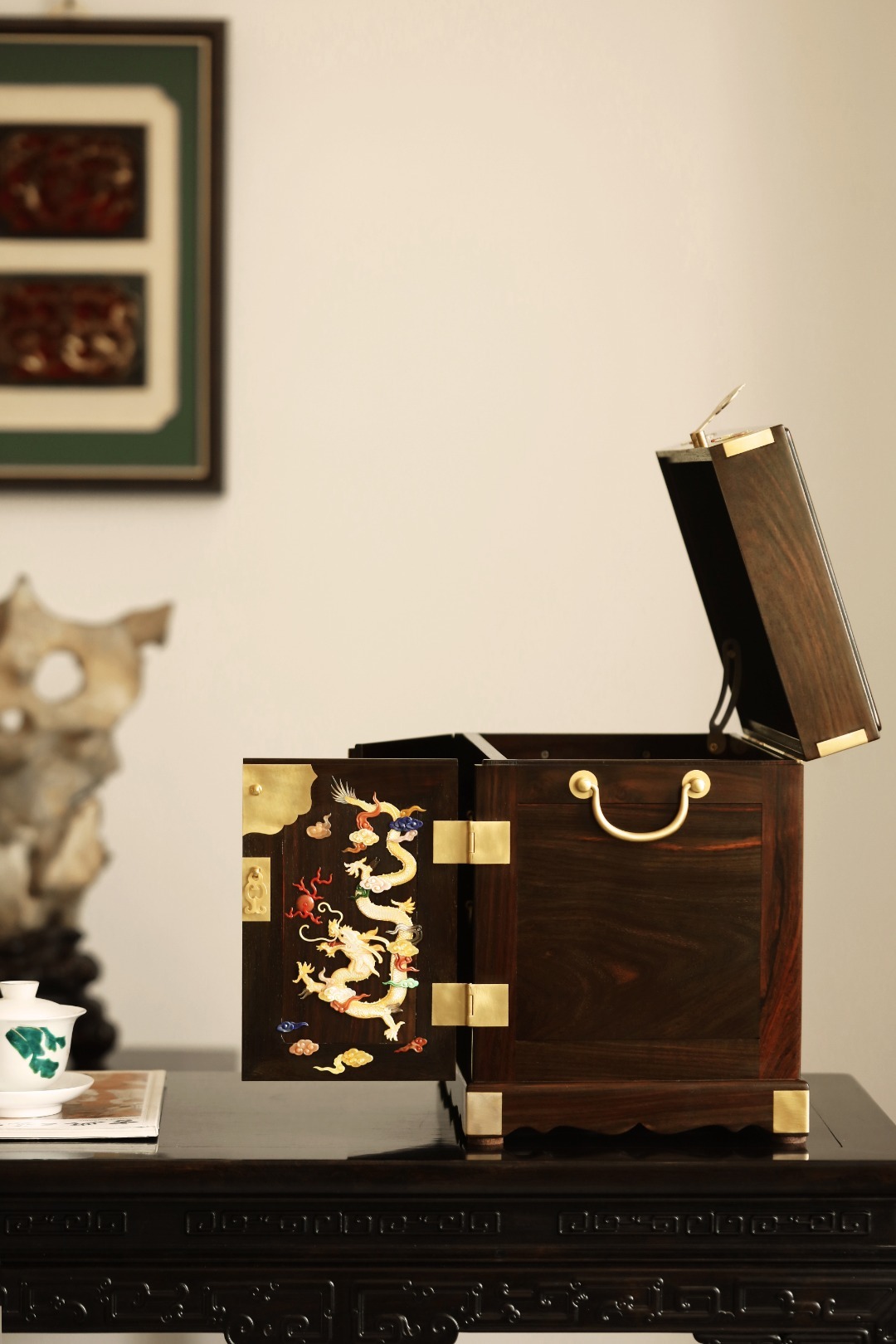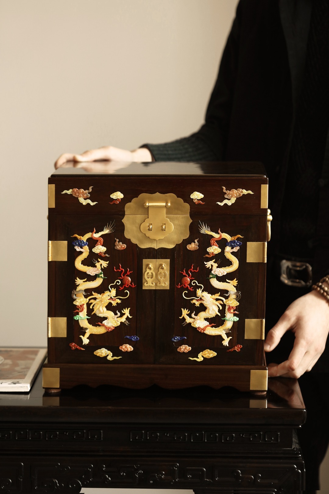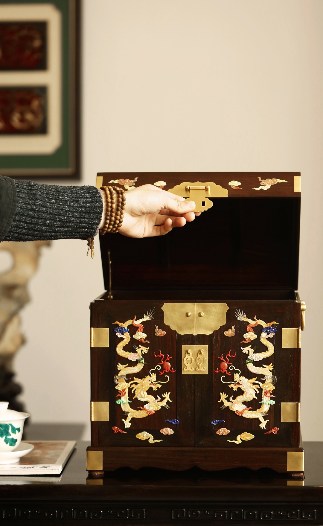 精选大红酸枝老料,全独板,百宝嵌雕双龙戏珠,姿声生动,色呈五彩流光金溢,祥云纹环绕尽显匠心,整器方正典尊贵奢华,多格收纳,传承臻品可宝可藏!