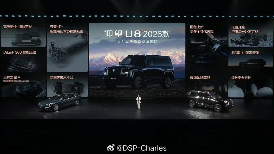 U8:综合续航提升20.5%至1205km,充电倍率提3倍达9C;搭载eTCS2.0扭矩控制更精准,云辇-P+升级双阀液压减震,越野+舒适再进阶,还配3nm 5G车机芯片+天神之眼5.0;