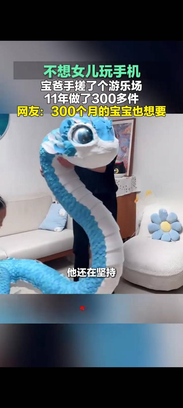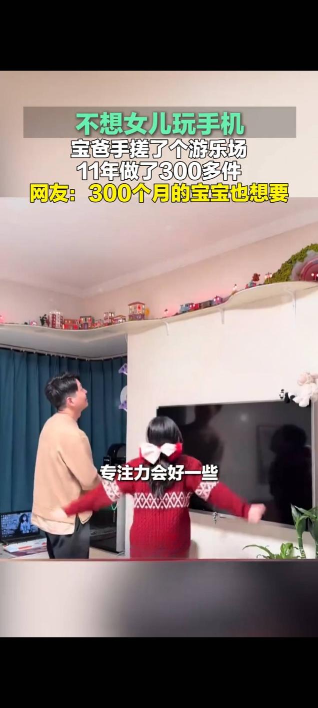 宝爸为戒女儿手机瘾 11年手作300余件玩具打造家庭游乐场 近日,河南郑州一位90后宝爸张帅的暖心举动在网络走红,其为让女儿远离手机,耗时11年亲手制作300多件玩具,在家打造出专属“私人游乐场”的视频,在快手平台播放量达14万次,引发网友热议。 据了解,张帅从女儿2岁多开始制作手工玩具,如今女儿已11岁,他的创作从未间断。起初因女儿接触电子产品,他便萌生做手工玩具的想法,用生活中随手可得的材料,耗时费力为女儿打造各类玩具,还会根据女儿的年龄和需求调整创作方向,从幼儿感统玩具到小学过家家道具,再到兼具学习功能的益智玩具,件件藏着用心。 创作过程中,张帅常与女儿共同参与,不仅让女儿放下手机,更培养了她的专注力。其故事被分享后,收获众多网友点赞,被直呼“硬核老爸”,还有网友调侃“300个月的宝宝也想要同款爸爸”。面对赞誉,张帅表示,制作玩具的最大意义是陪伴女儿成长,未来也会继续坚持这份充满爱的创作。娃沉迷于手机 儿童手机瘾 老爸为女儿制作玩具