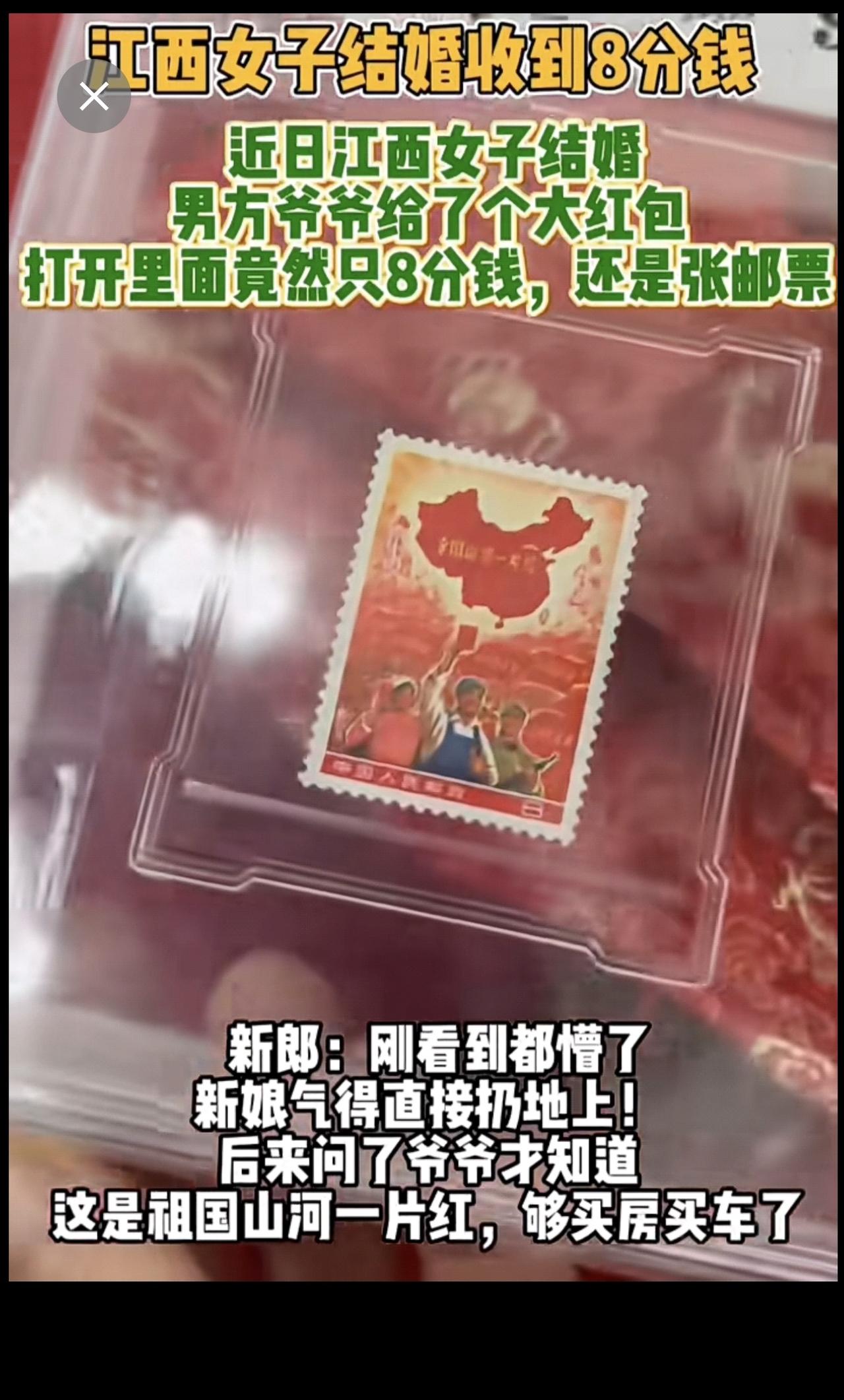 江西女子结婚收到8分钱 近日江西女子结婚 男方爷爷给了个大红包 打开里面竟然只8分钱,还是张邮票 新郎:刚看到都懵了 新娘气得直接扔地上[星星眼]