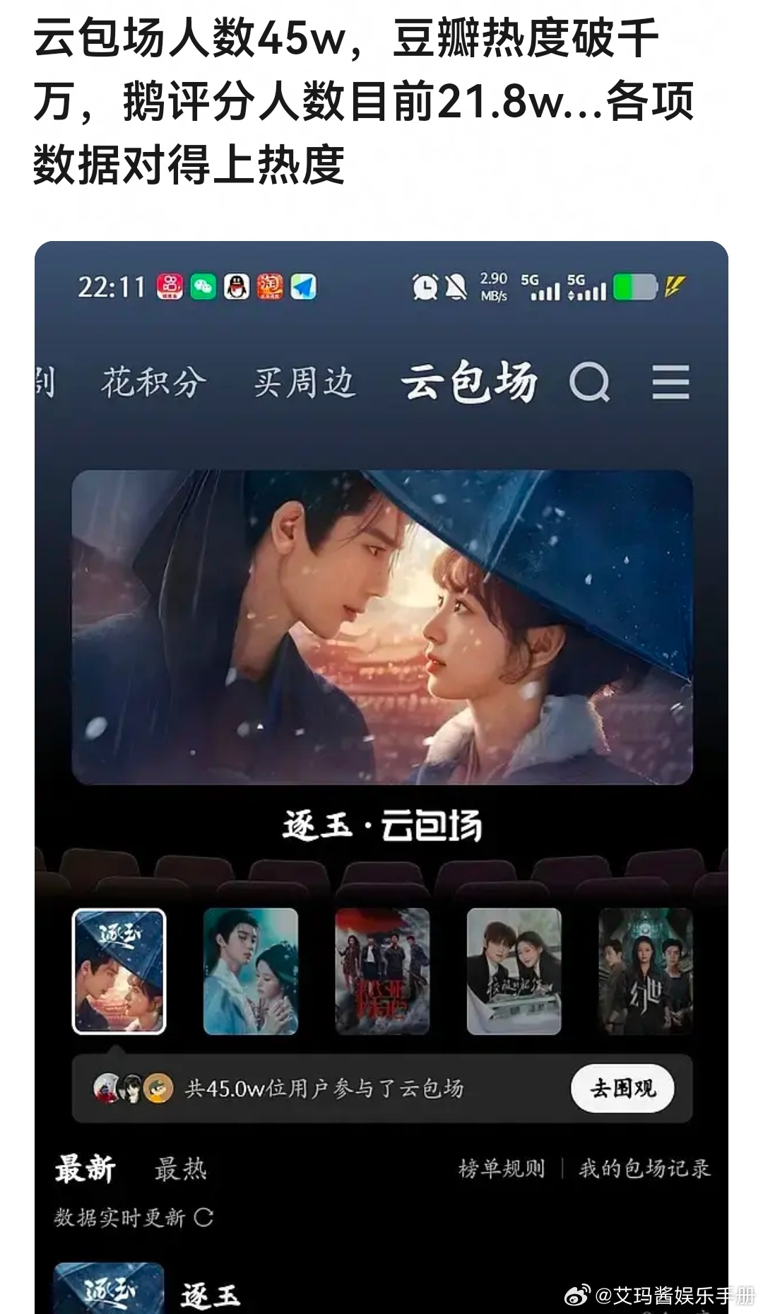 《逐玉》首日开播热度!云包场人数45w,豆瓣热度破千万,🐧评分人数目前21.8