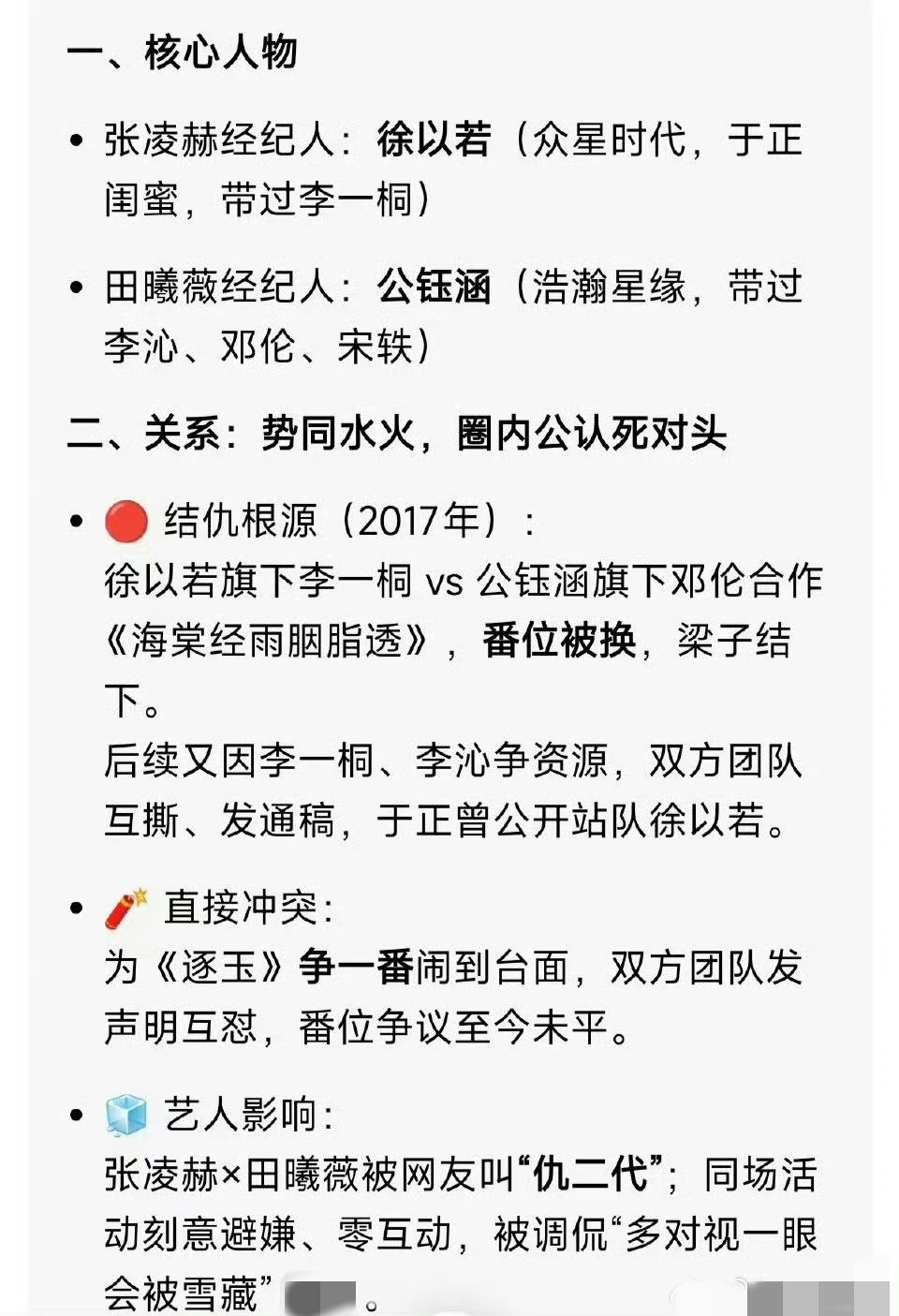 张凌赫和田曦薇主演的《逐玉》剧宣,几人在连麦直播时,田曦薇说和张凌赫还蛮有缘分的,包括他们的经纪人。 话音刚落张凌赫慌乱的反问田曦薇:“你说啥?”田曦薇可能也反应过来自己说了不该说的事,心虚的退出画面。 张凌赫经纪人徐以若和田曦薇经纪人公钰涵其实是娱乐圈公认的死对头,关系可以说是势如水火。 两人带的艺人李一桐和邓伦因为番位资源分配不平衡结下梁子,当时徐以若带的艺人李一桐和公钰涵带的艺人邓伦合作《海棠经雨胭脂透》一开始讲的好好的,后来因为番位临时调整,两人翻脸结下梁子。 如果说这还可以和解,那后来李一桐和李沁又因为资源上的竞争,两位经纪人的关系彻底结仇,真的就跟仇人一样。 他们的关系不好,直接影响他们各自带的艺人,张凌赫和田曦薇没合作《逐玉》之前,两人在活动上遇见,都不敢打招呼交流,就怕经纪人会生气。 张凌赫:“我经纪人不让我跟你讲话,”田曦薇:“好巧,我也是。”