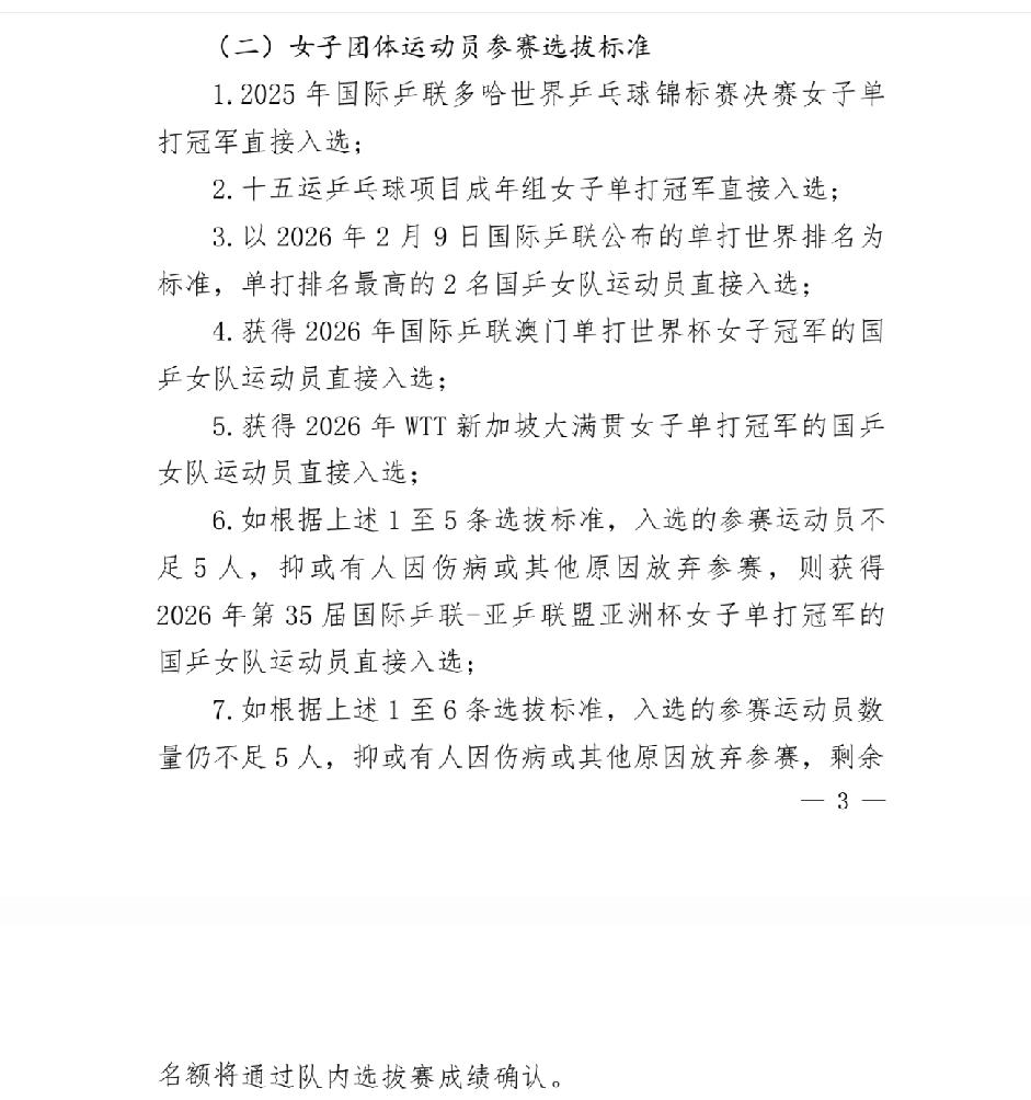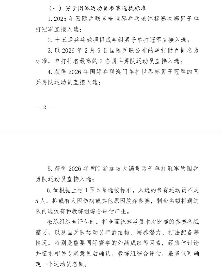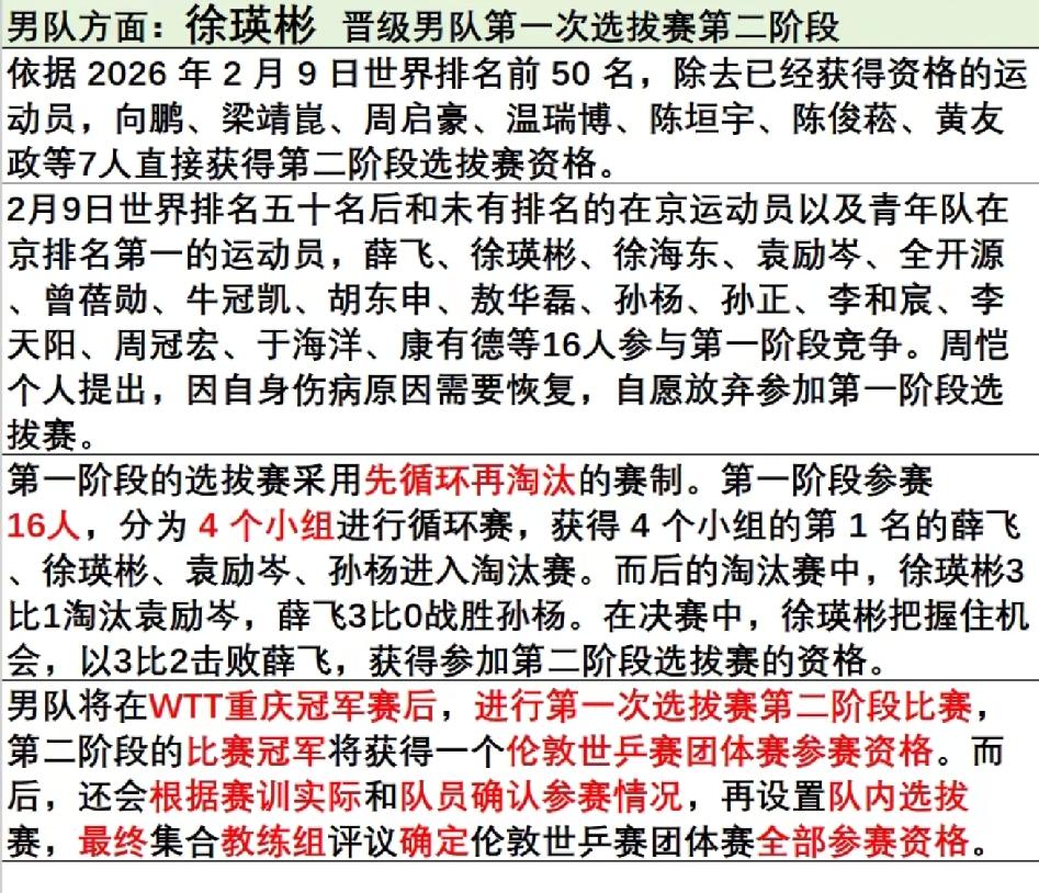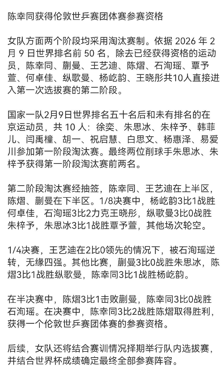陈幸同选拔赛夺冠直通2026年伦敦世乒赛 3月4日~6日,国乒进行了2026年伦敦世乒赛选拔赛,陈幸同杀出重围,夺冠直通伦敦世乒赛。 根据国乒2026年2月13日公布的《2026年国际乒联伦敦世界乒乓球团体锦标赛选拔办法》: 第一条,2025年多哈世乒赛单打冠军直接入围:男子:王楚钦;女子:孙颖莎 第二条,第十五届全运会单打冠军直接入围:男子:樊振东;女子:王曼昱 第三条:2026年2月9日国际乒联公布的世界排名,单打排名最高的两位直接入围:男子:王楚钦和林诗栋;女子:孙颖莎和王曼昱 第四条,2026年国际乒联澳门单打世界杯冠军直接入围。(还未进行) 第五条,2026年新加坡大满贯赛单打冠军直接入围:男子:王楚钦;女子:孙颖莎 第六条,仅限女子,2026年亚洲杯女子单打冠军直接入围:孙颖莎 第7条:若男子根据前5条标准或女子根据前6条标准入选的运动员数量不足5人,要进行队内选拔赛。 由于重复入围的原因,目前男子入围的有樊振东,王楚钦和林诗栋3人,女子有孙颖莎和王曼昱2人,即使澳门单打世界杯的两个冠军都被国乒包揽且不是上述5人,那也是男子4人,女子3人,更何况澳门单打世界杯的冠军十有八九还在这几人中产生,换句话说,一定要启用第七条,选拔赛势在必行。 女子选拔赛经过两轮淘汰选拔赛,最终陈幸同夺冠,也就是说陈幸同已获得直通伦敦世乒赛的门票,女子孙颖莎,王曼昱和陈幸同已入围。 男子进行了选拔赛的第一阶段,先循环再淘汰,最后徐瑛彬脱颖而出,徐瑛彬并未直通,只是获得晋级第二阶段淘汰赛的资格,第二阶段淘汰赛的冠军才获得直通门票,第二阶段淘汰赛的选拔在重庆冠军赛后进行。 详细淘汰过程,参看下图。