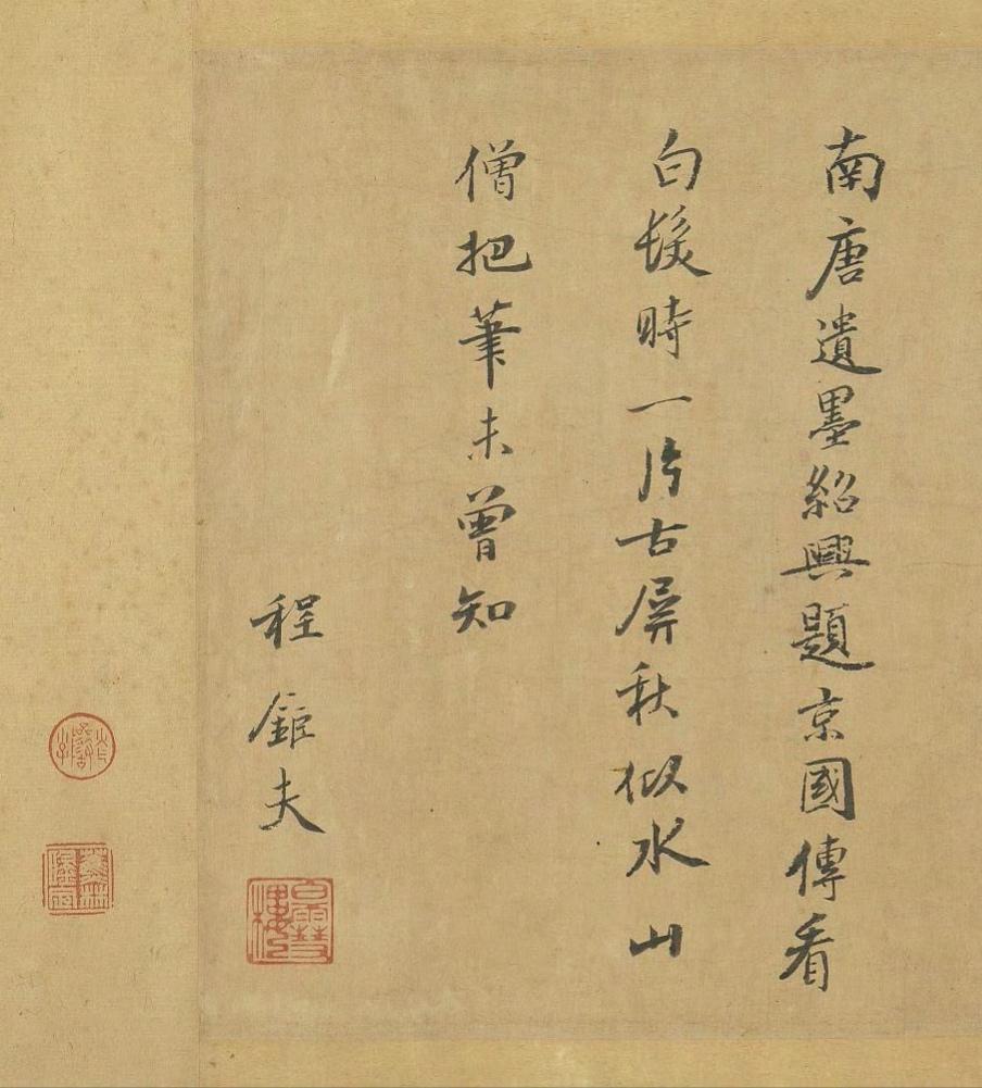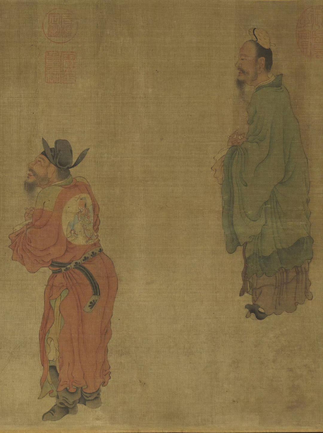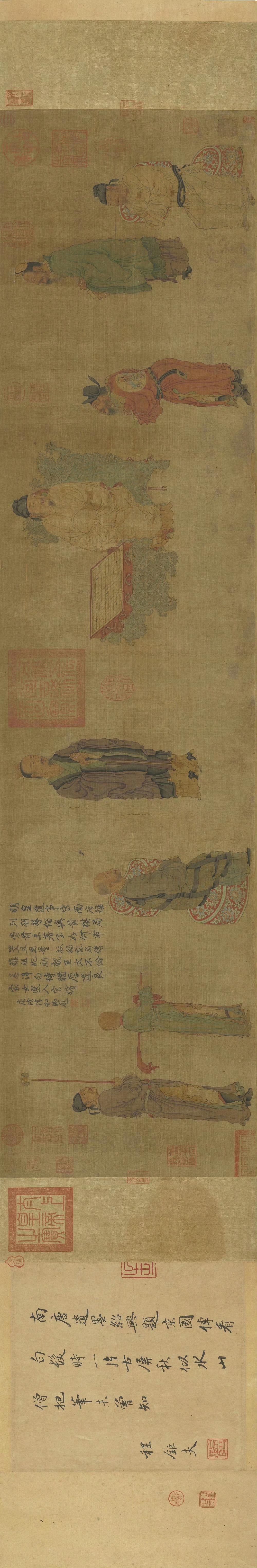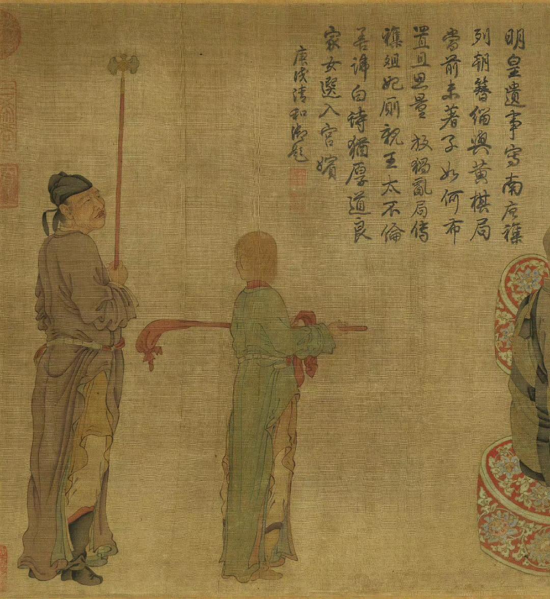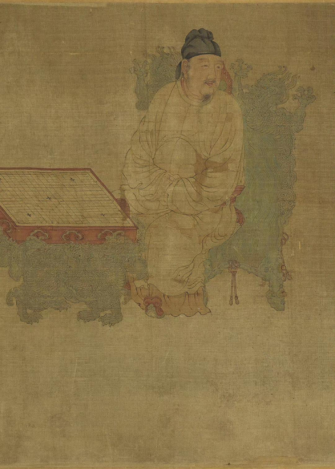 《明皇会棋图》卷传为五代南唐周文矩画。旧传描绘唐代宫廷的围棋活动,唐明皇(玄宗)坐龙椅,前置棋盘,其上空无一子,而优伶拱手而立,好像有话要说,大概是描写优人向皇帝进谏的故事。全卷设色淡雅,衣纹线条细腻,人物表情生动。此卷现藏于台北故宫博物院。