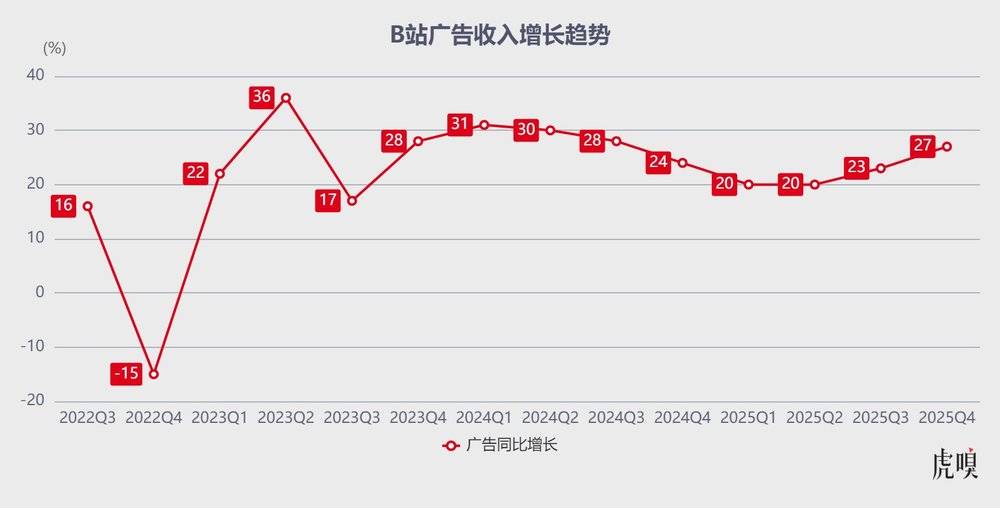 财报显示,2025年第四季度B站广告收入30.4亿元,同比增长27%,连续12个季度保持同比高速增长;全年广告收入突破100.6亿元,同比增长23%,在总营收中占比提升至37%,成为仅次于增值服务的第二大收入来源。