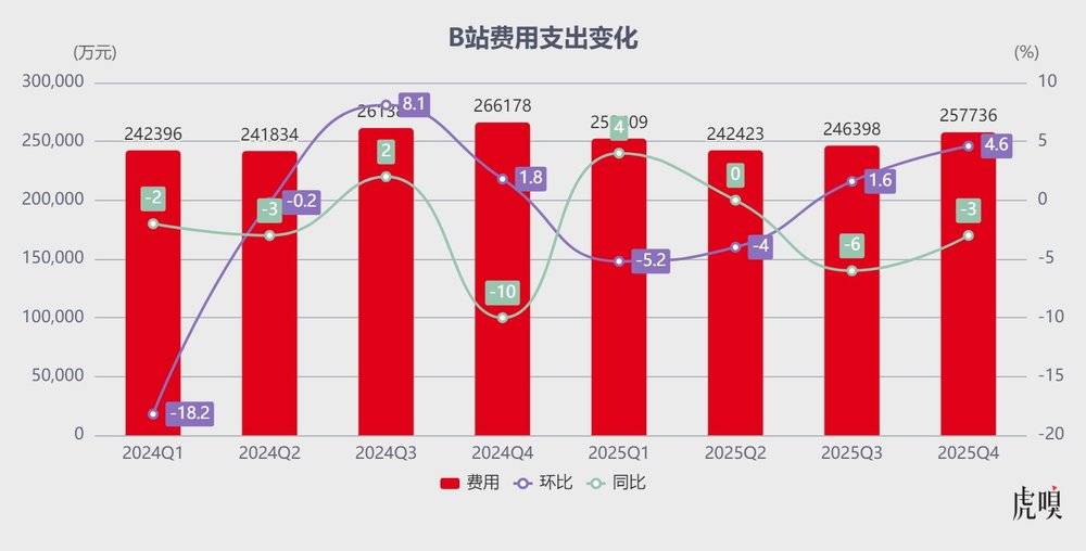 财报清晰展现了B站在成本管控上的成果:2025Q4B站营业成本52.4亿元,同比仅增长6%,低于8%的营收增速;经营开支25.8亿元,同比下降3%,其中销售及营销开支11.3亿元,同比减少9%,研发开支保持9.21亿元,实现了“降本不缩核心投入”的精准管控。