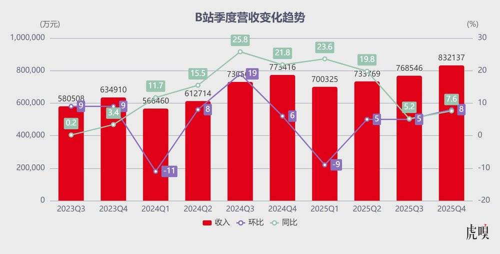 财报显示,2025Q4平台增值服务收入32.6亿元,同比增长6%;全年收入119.3亿元,同比增长8%,在总营收中占比达39%,仍是B站第一大收入来源。
